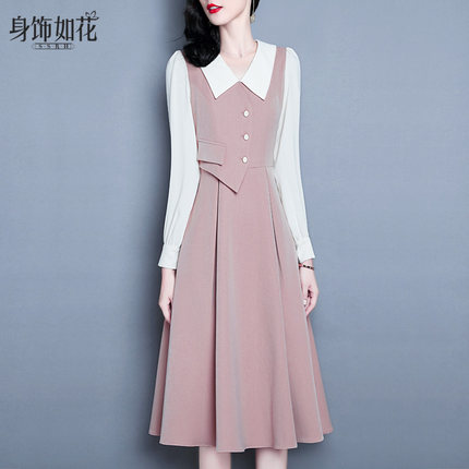 2025春秋新款气质修身白粉撞色A字裙中长款粉色娃娃领长袖连衣裙