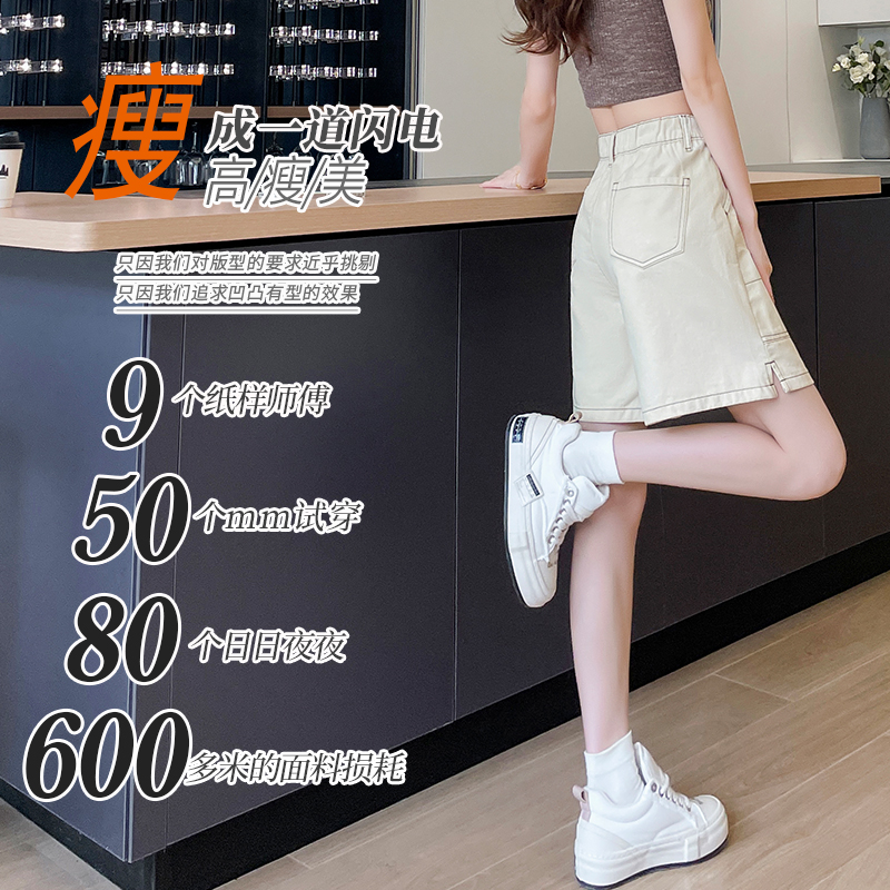 杏色高腰五分牛仔短裤女2025夏薄款宽松松紧腰小个子a字阔腿中裤