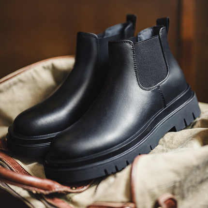 马登切尔西男靴德比鞋一脚蹬厚底增高靴子休闲秋冬黑色短靴马丁靴