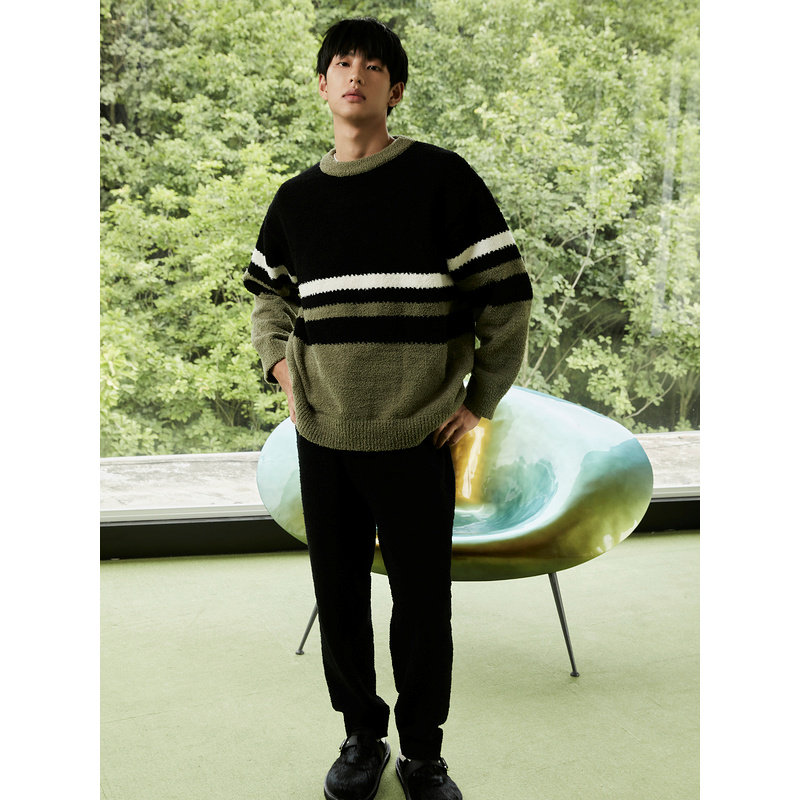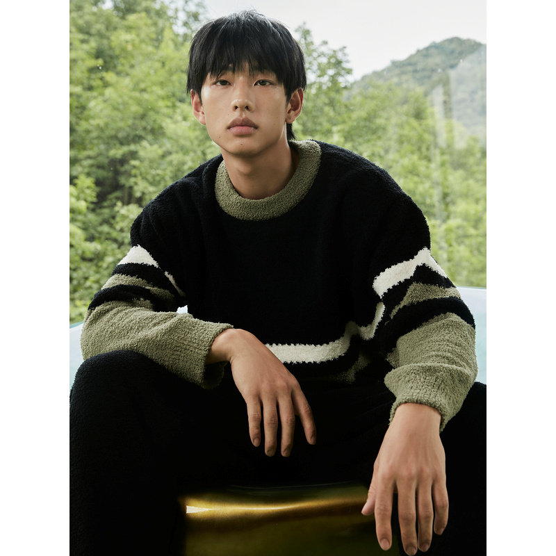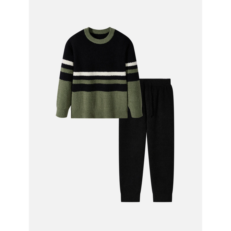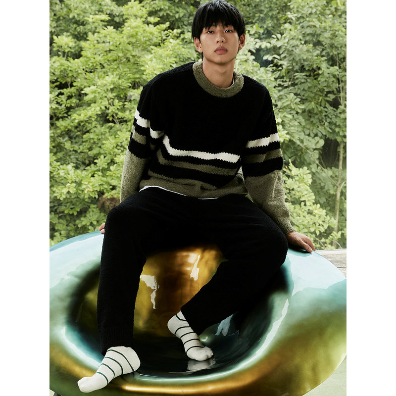 GXG男士家居套装黑绿条纹半边绒套头家居家服