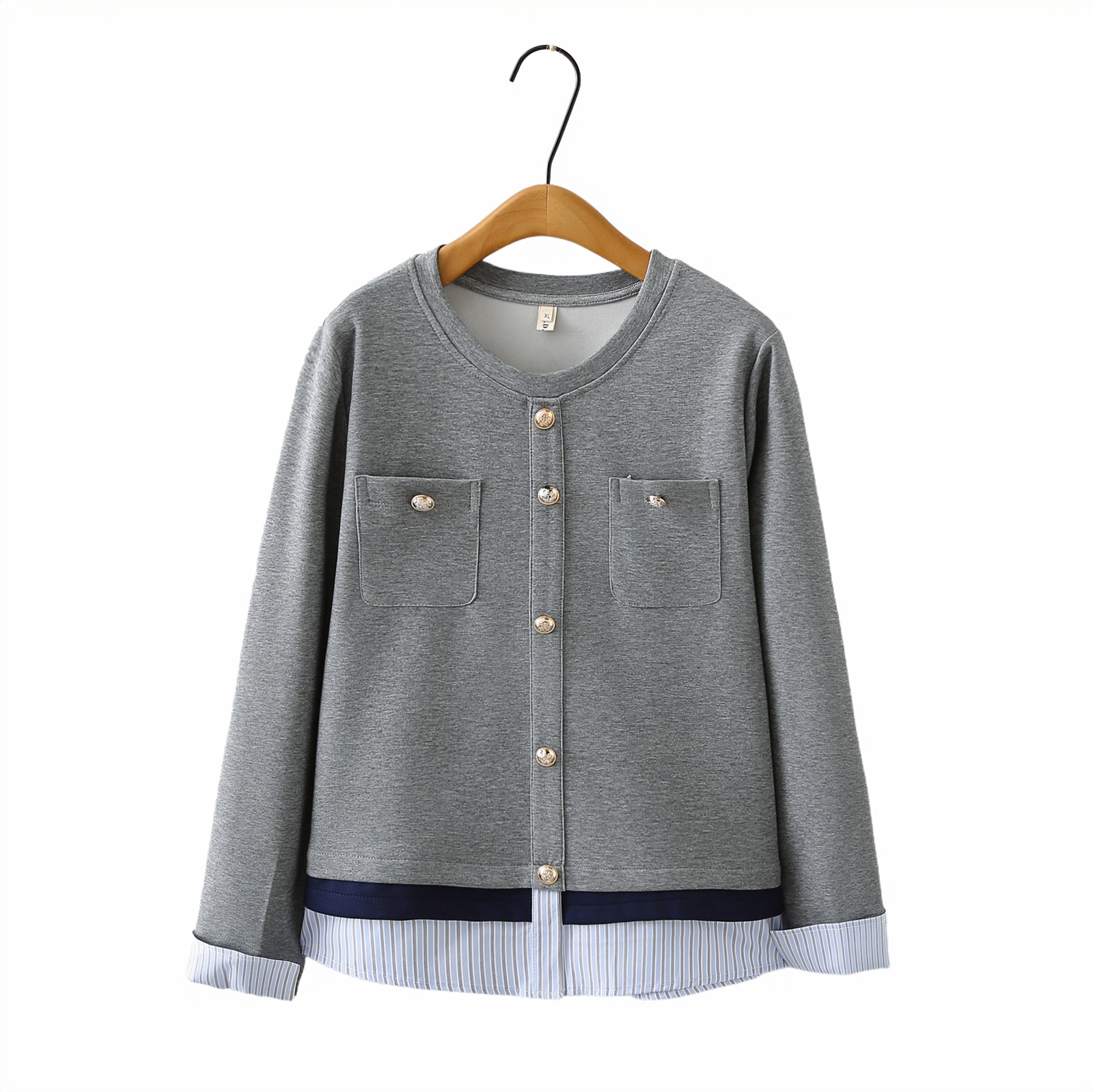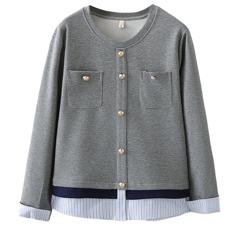 大码秋装新款圆领双口袋金属扣拼接条纹长袖卫衣宽松显瘦打底上衣