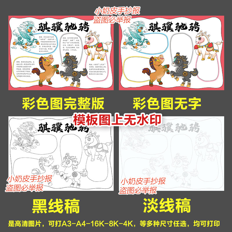 2026马年春晚吉祥物骐骥驰骋手抄报小报卡通儿童画黑白线稿半成品