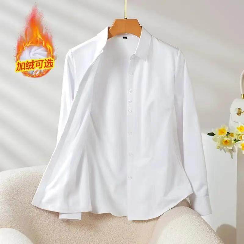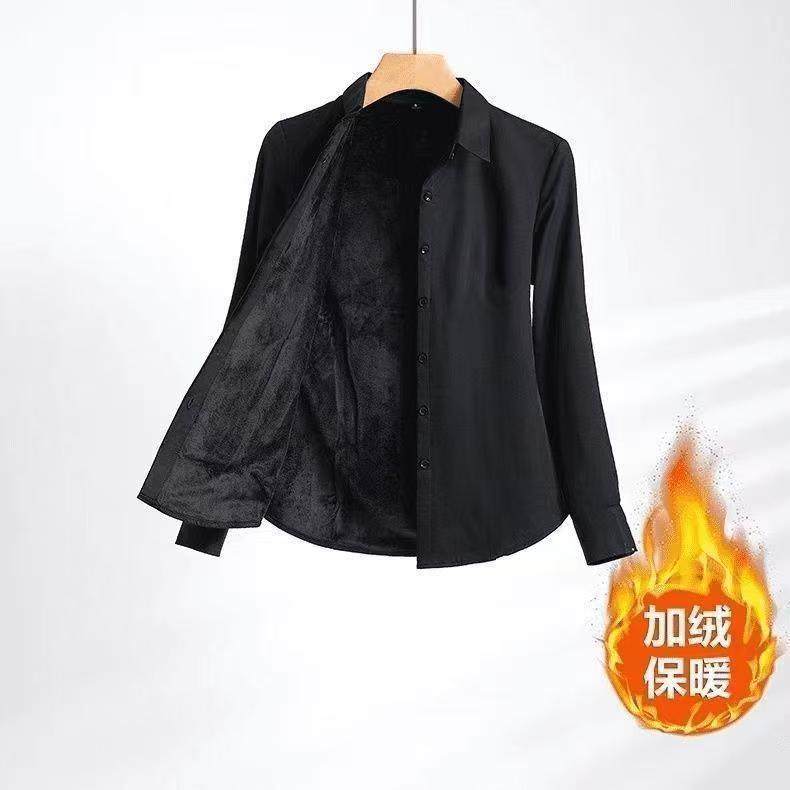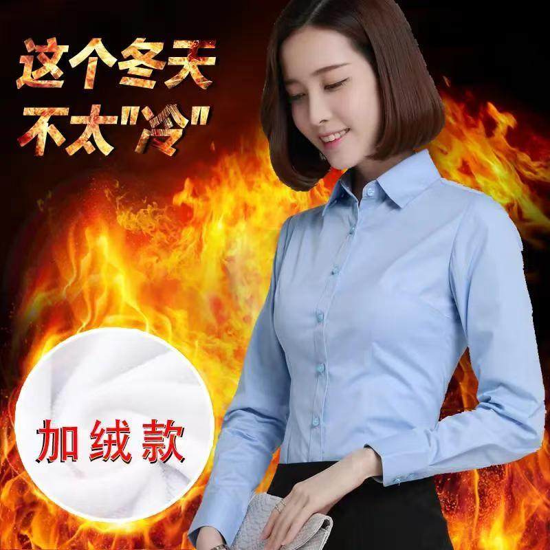 加绒职业装蓝色衬衫女秋冬长袖一体绒修身工装保暖白衬衣女工作服