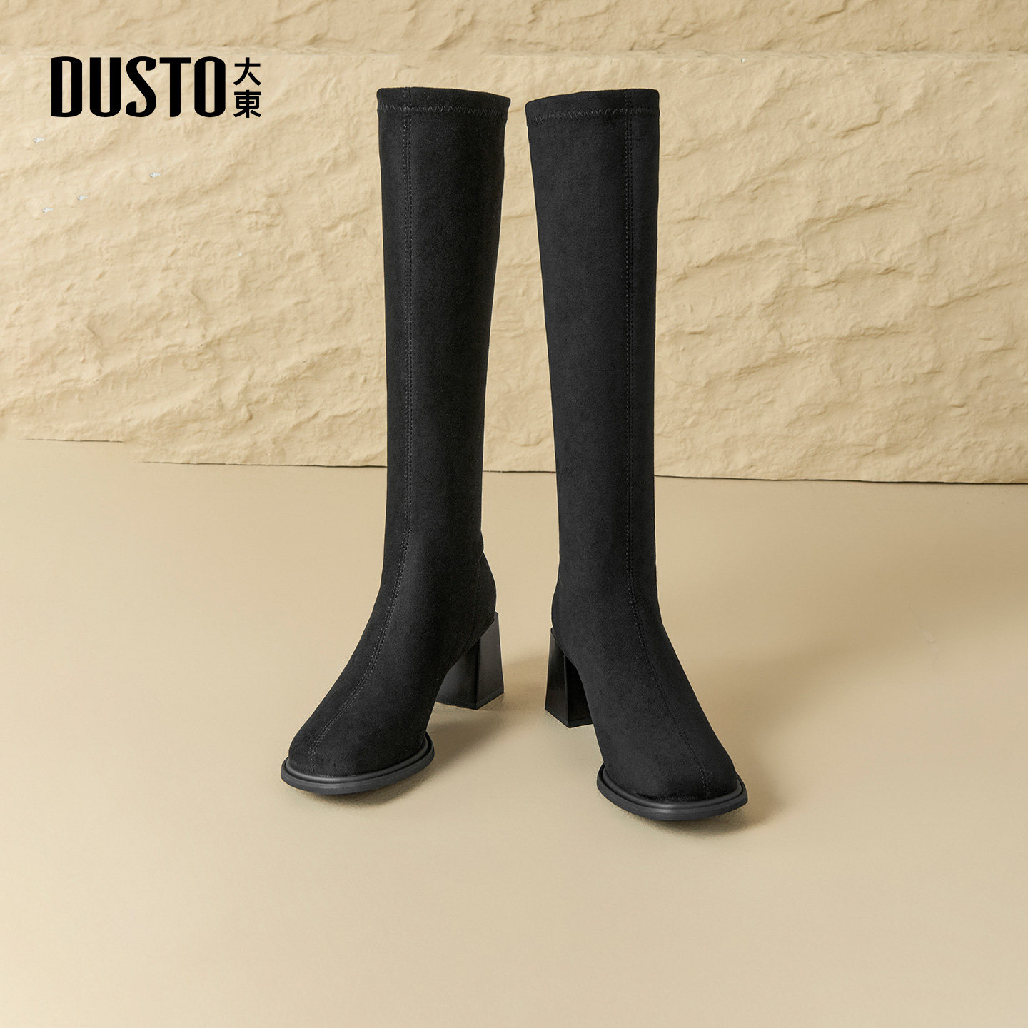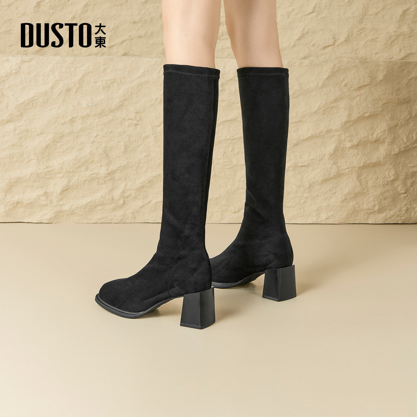 大东长筒靴女鞋2025新款冬季简约粗跟高筒靴瘦瘦靴黑色方头高跟靴
