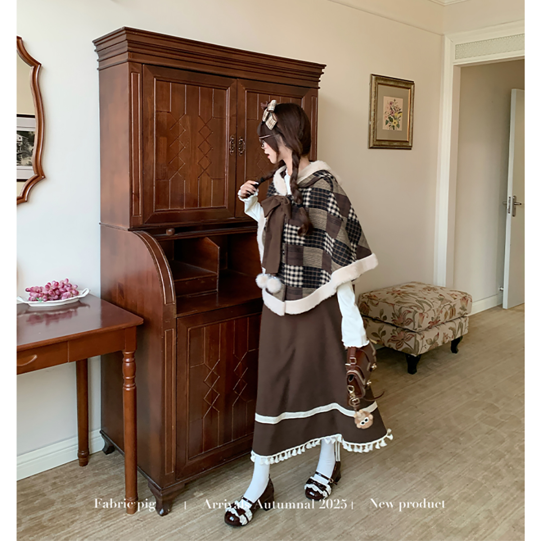 织物猪 燕麦巧巧 少女慵懒感棕色斗篷套装女冬披肩外套长裙两件套