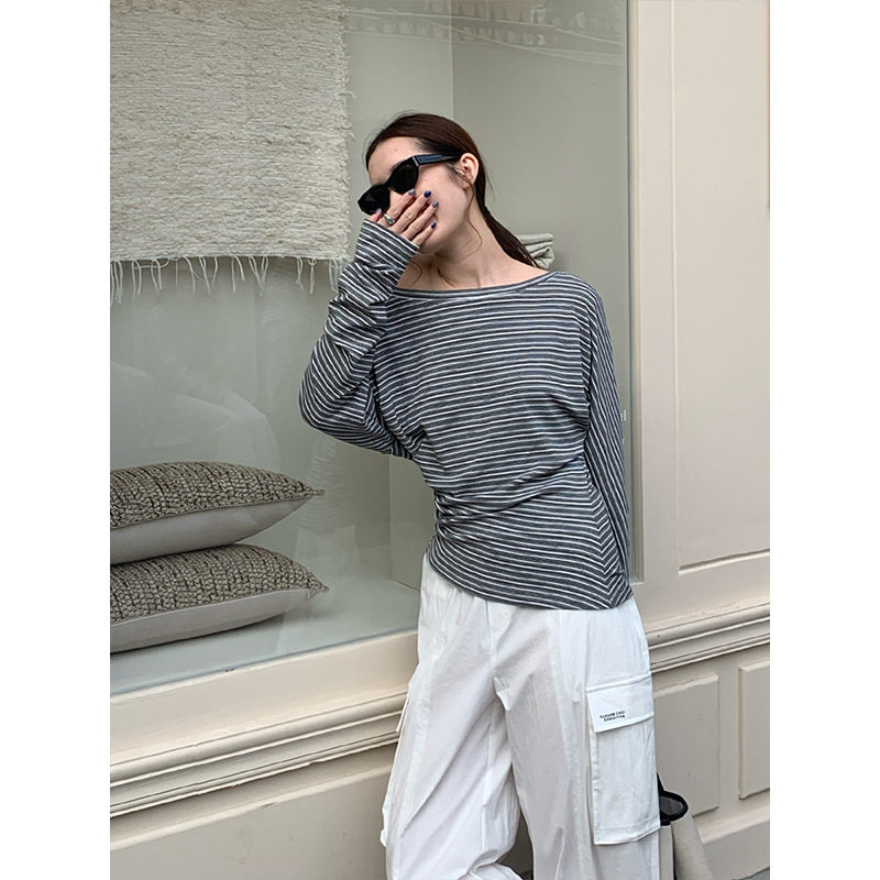 天丝条纹撞色褶皱宽松长袖T恤女