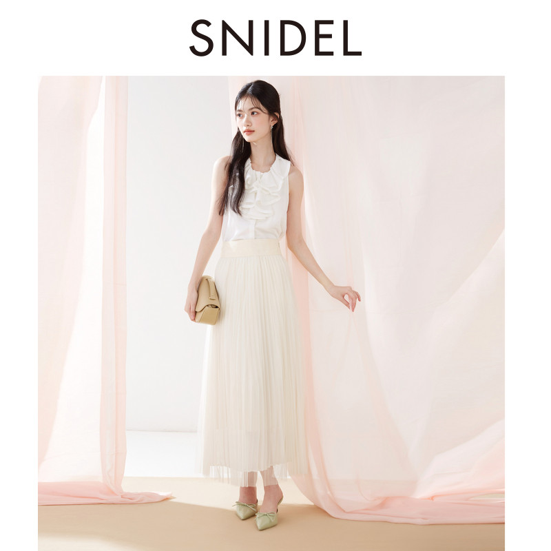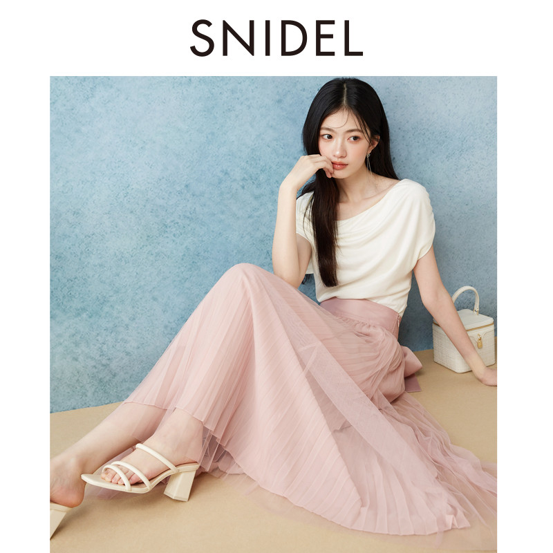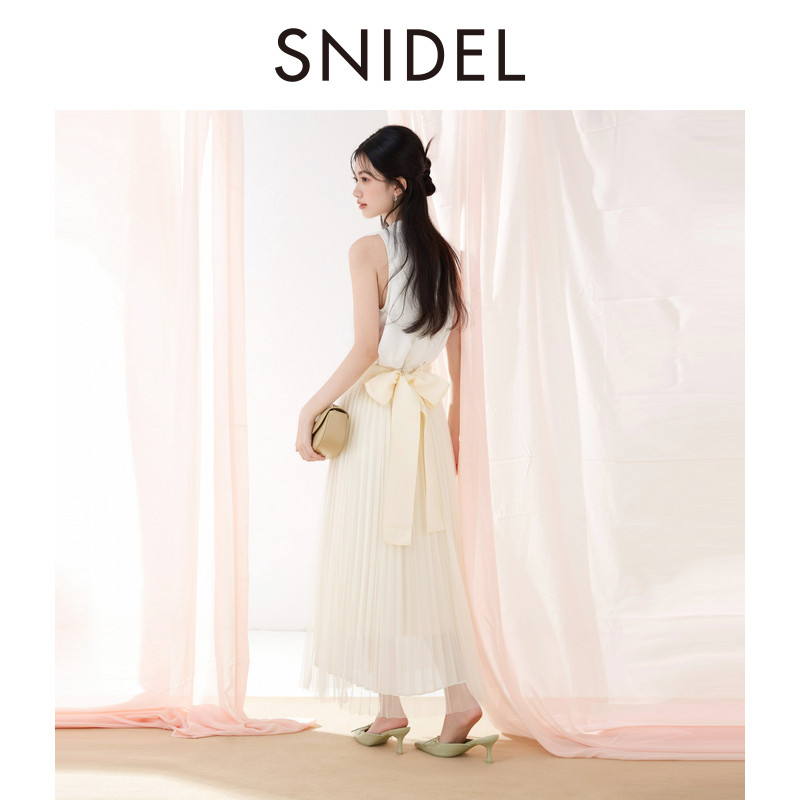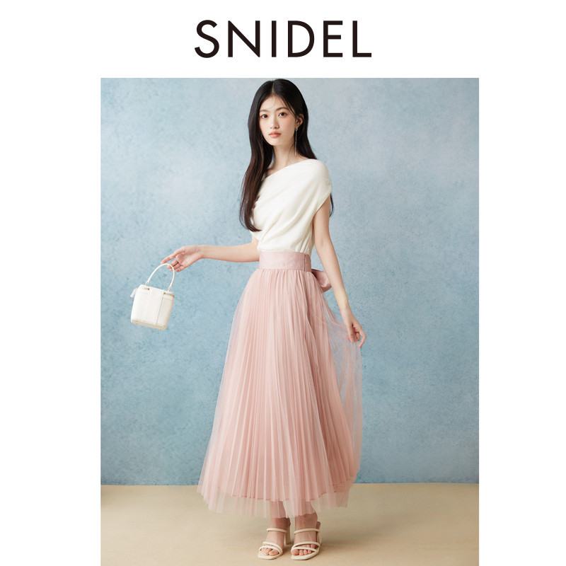 SNIDEL2025春夏新品时尚高腰蝴蝶结系带雪纺百褶半身裙SWFS252309
