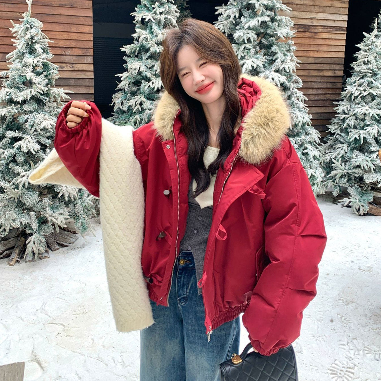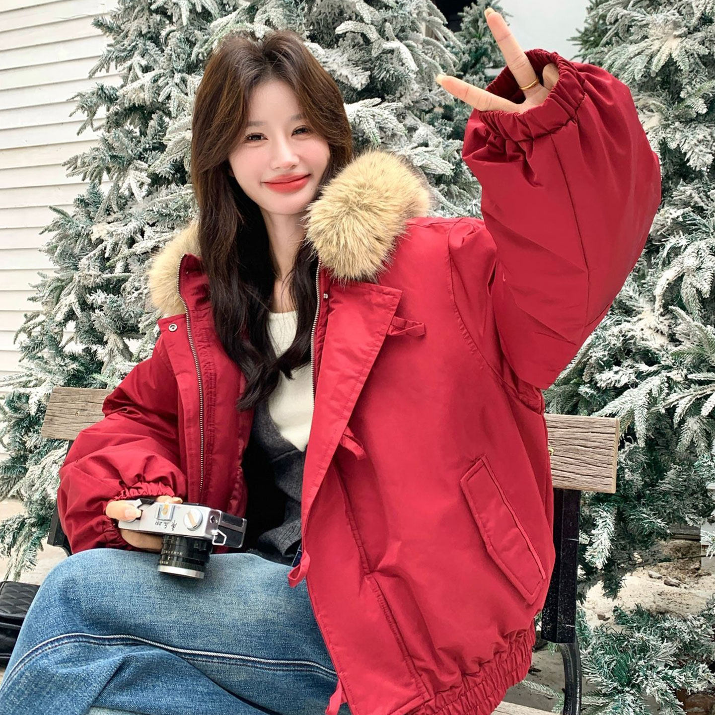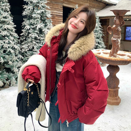 大码女装胖mm红色牛角扣毛领外套女冬季加厚保暖韩版ins派克棉服