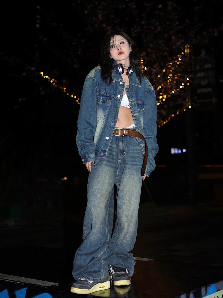 夏季美式复古宽松牛仔套装休闲裤