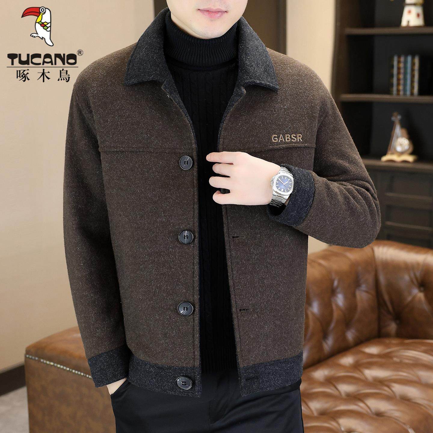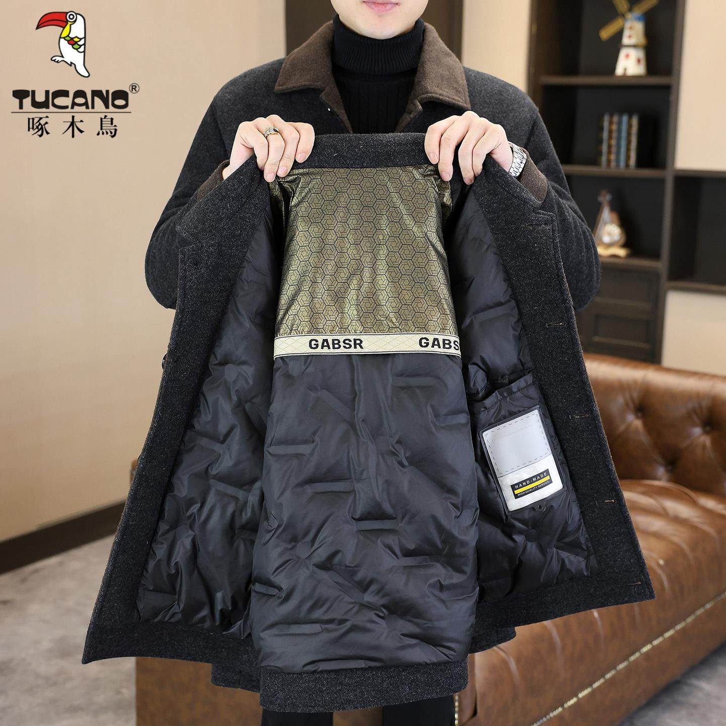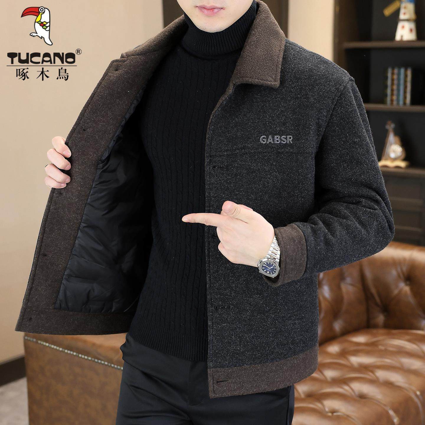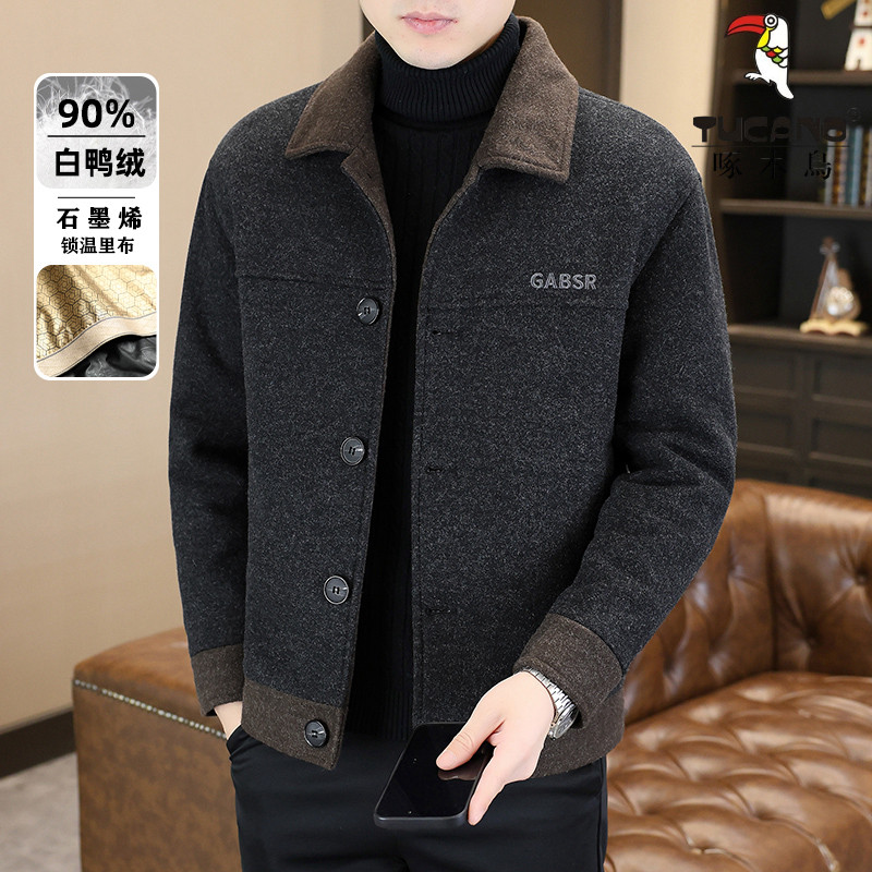 啄木鸟冬季男士毛呢大衣短款翻领夹克休闲保暖白鸭绒羽绒服外套男