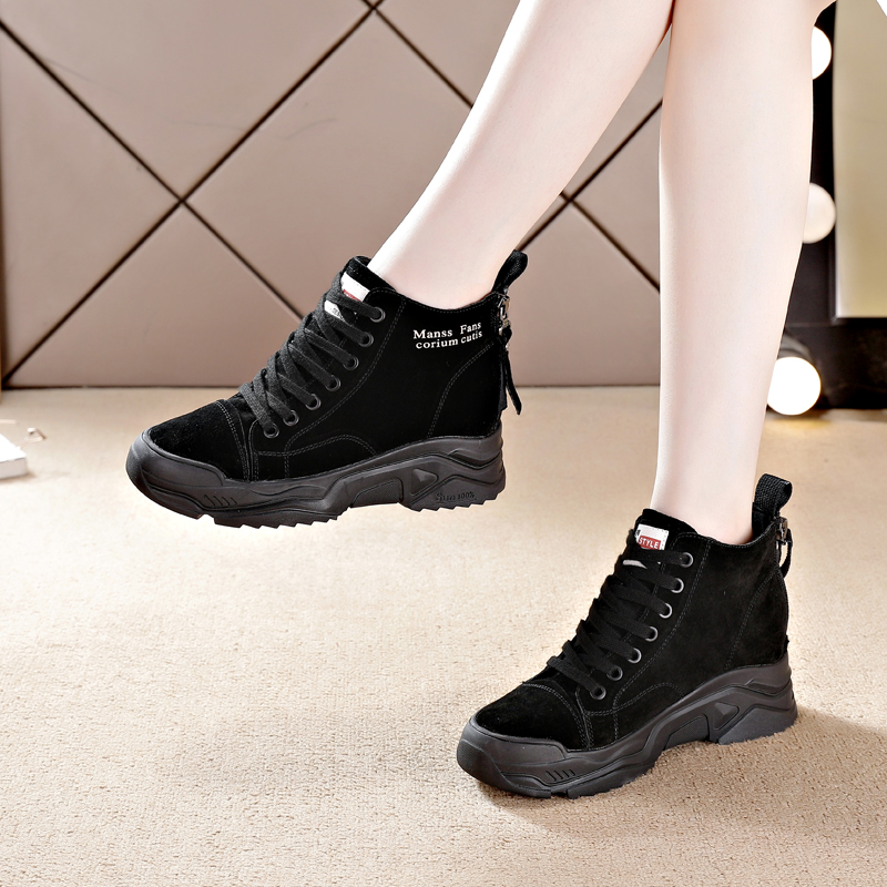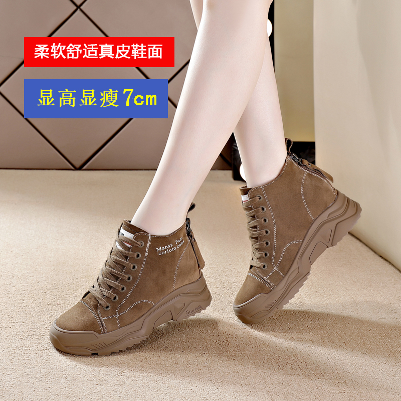 真皮内增高女鞋秋冬季新款后拉链马丁靴软底高帮休闲厚底加绒短靴
