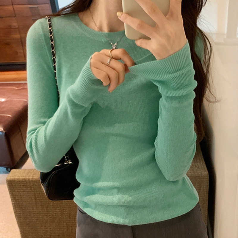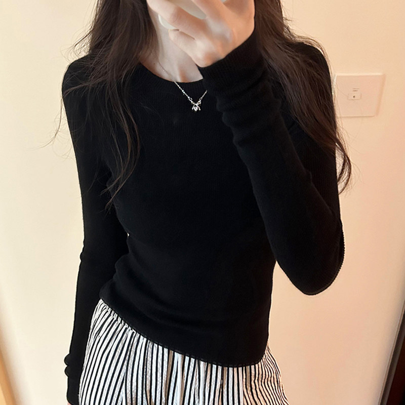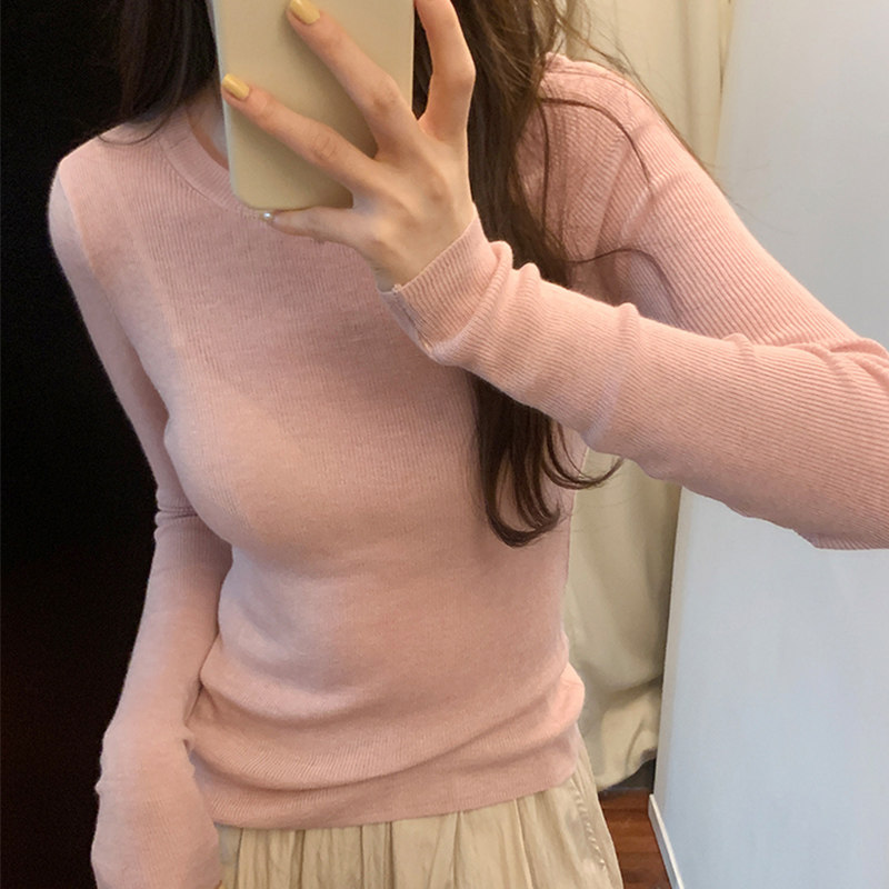奶白色圆领针织衫女薄款洋气春秋季韩系简约风穿搭修身打底衫上衣