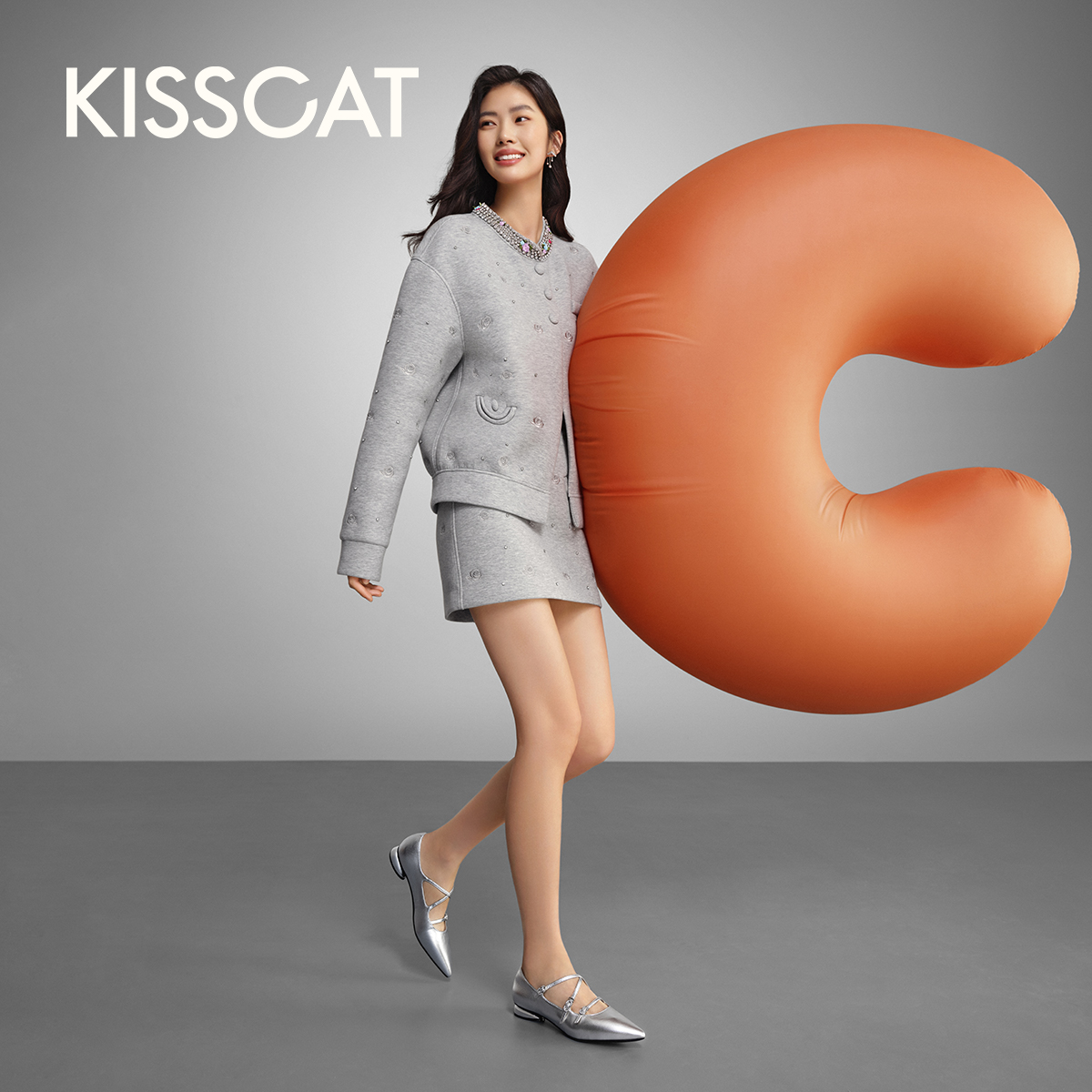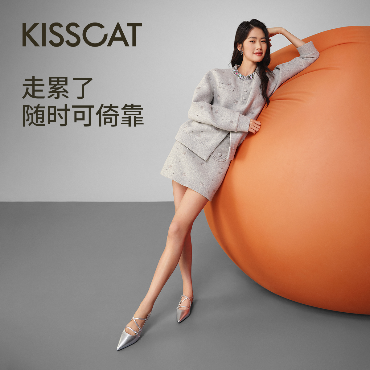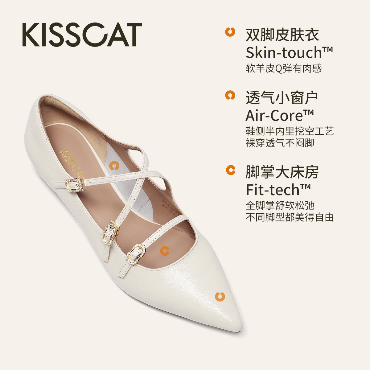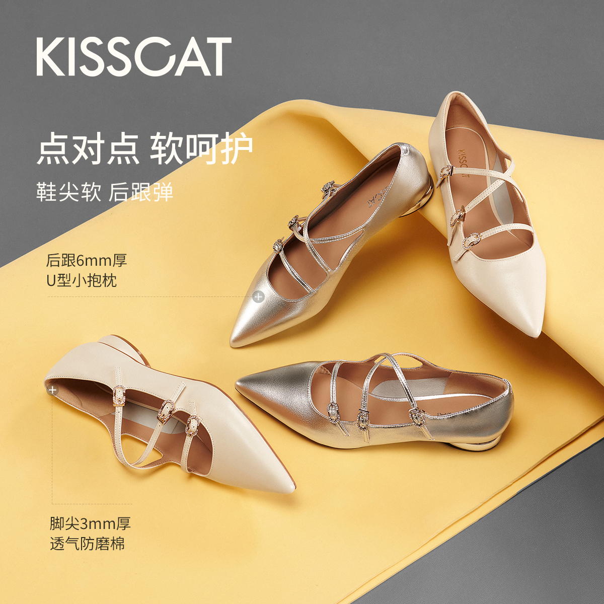 KISSCAT接吻猫[小梦露玛丽珍]真皮单鞋尖头平底鞋法式银色玛丽珍