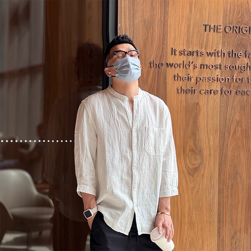 春夏季亚麻立领七分袖男士衬衫日系休闲宽松百搭薄款青年帅气衬衣