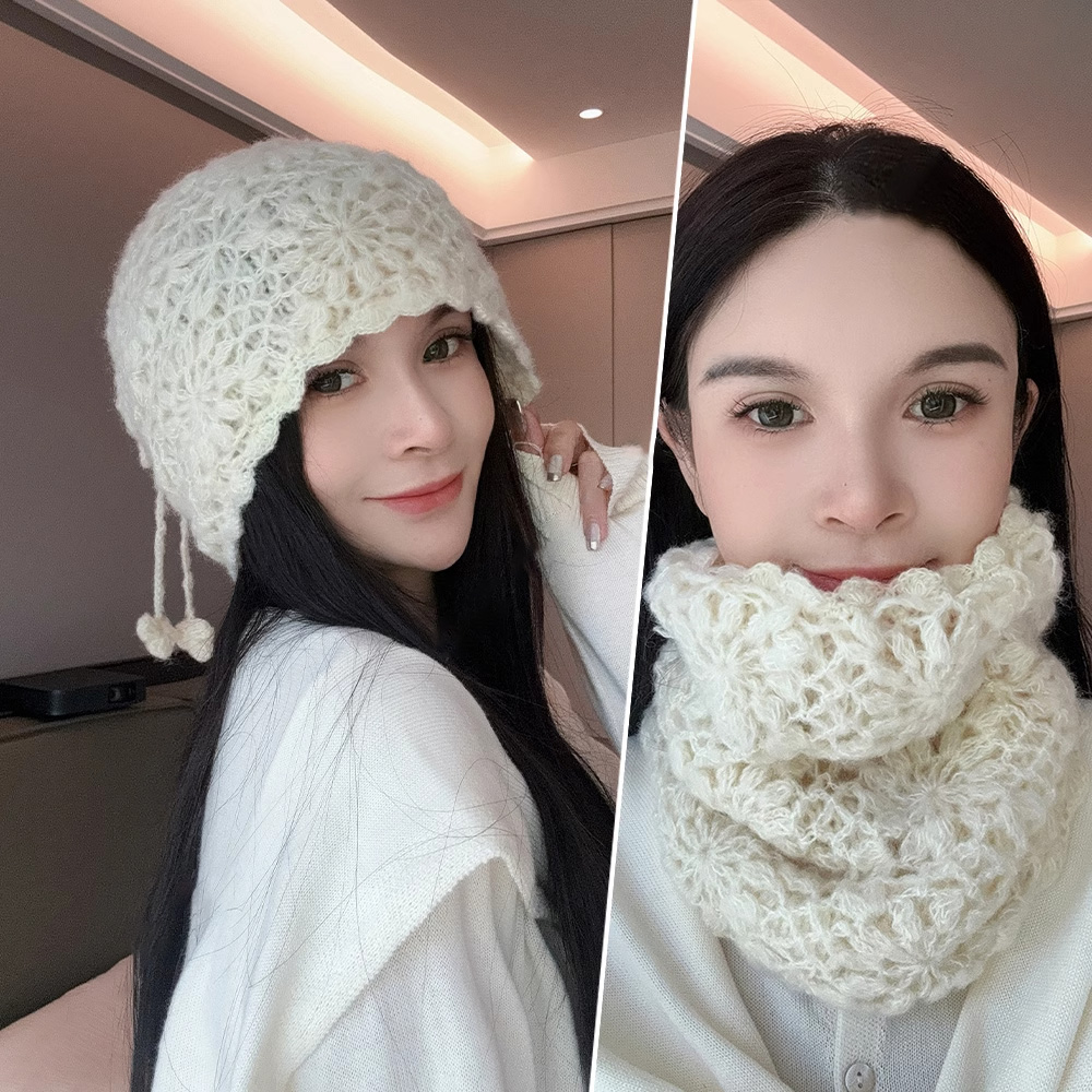 手工钩花围脖一体针织帽子女春秋季保暖护脖毛线帽洋气百搭包头帽