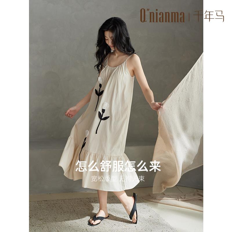 千年马睡裙女夏季吊带防凸点带胸垫2025新款梭织纯棉女士睡衣裙子