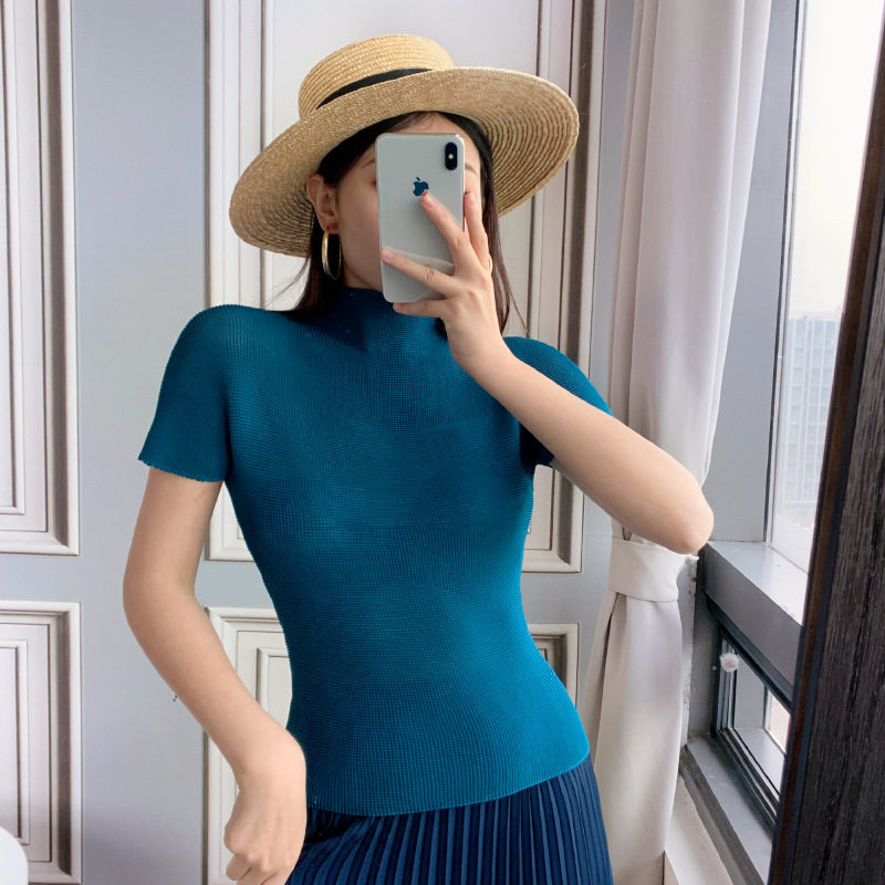 三宅短袖t恤衫女薄款春夏新款打底雪纺衫气质半高领褶皱上衣女士