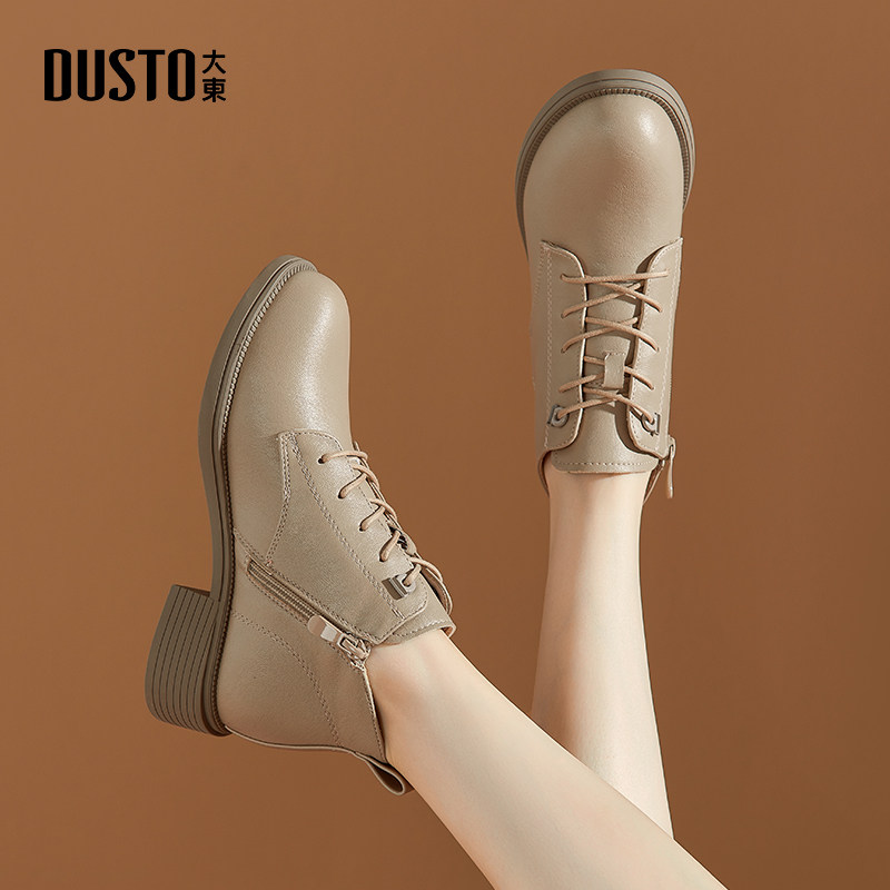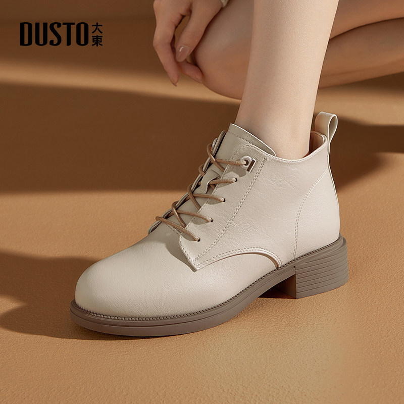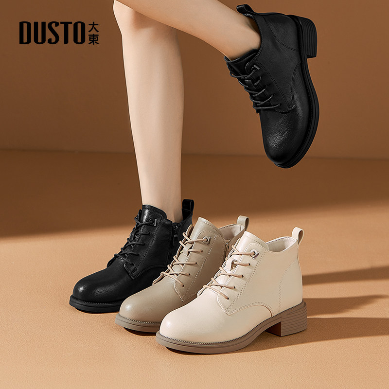 大东女鞋时装靴2025秋冬新款优雅女短靴系带圆头粗跟加绒短筒靴子