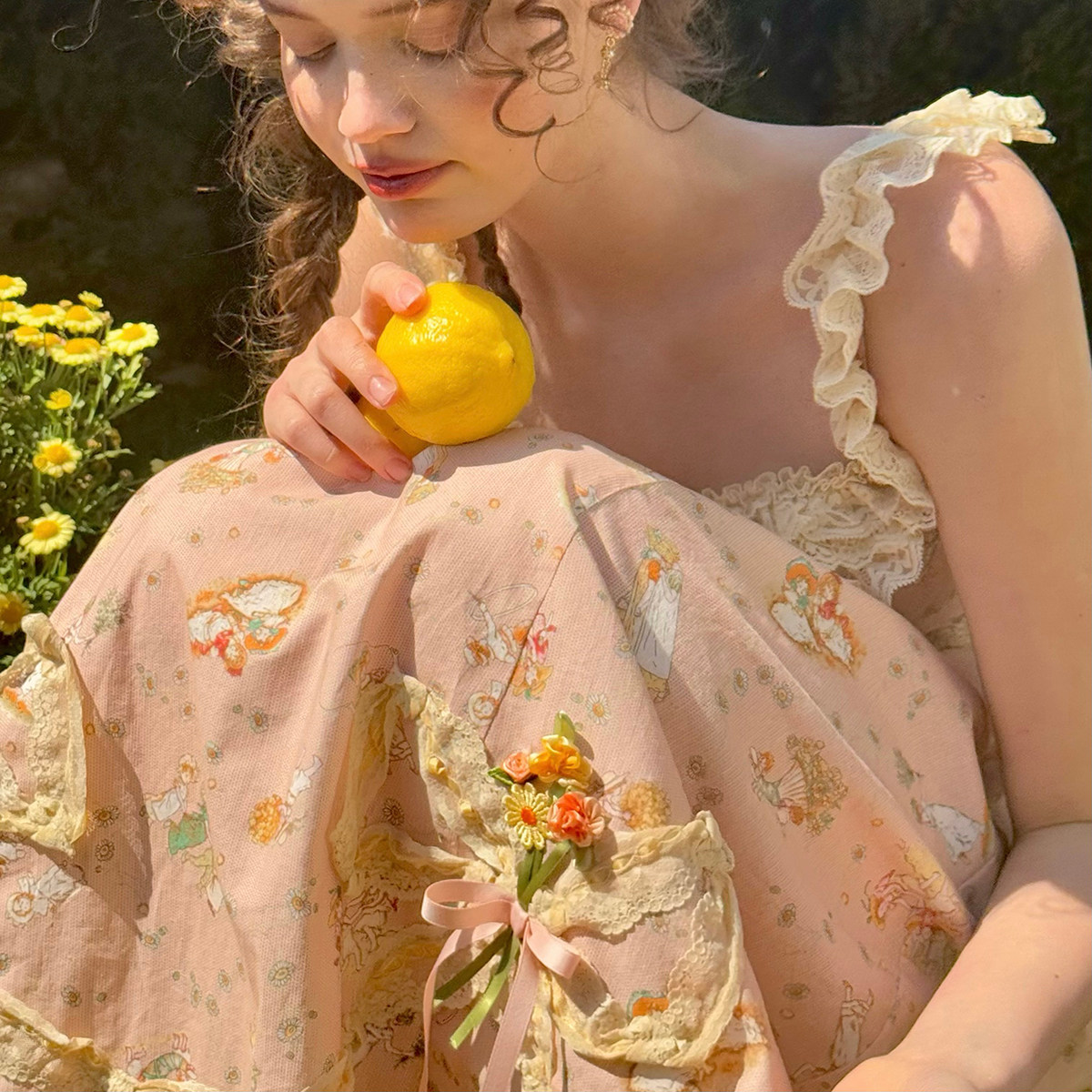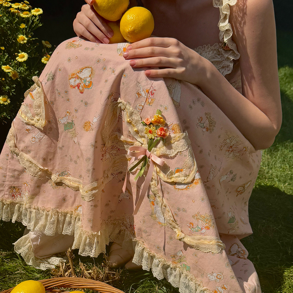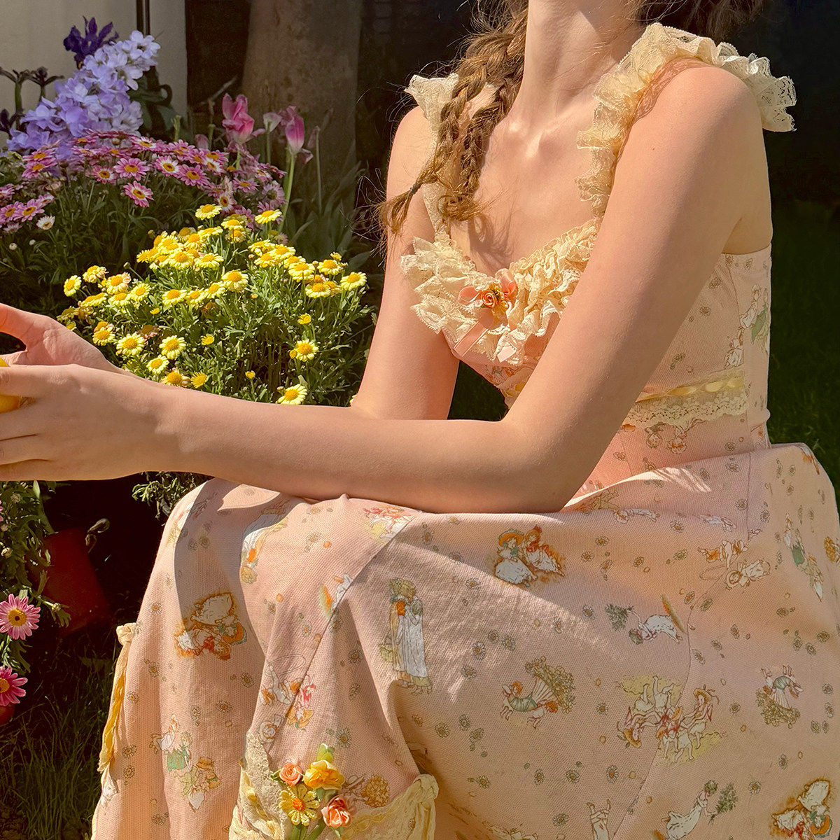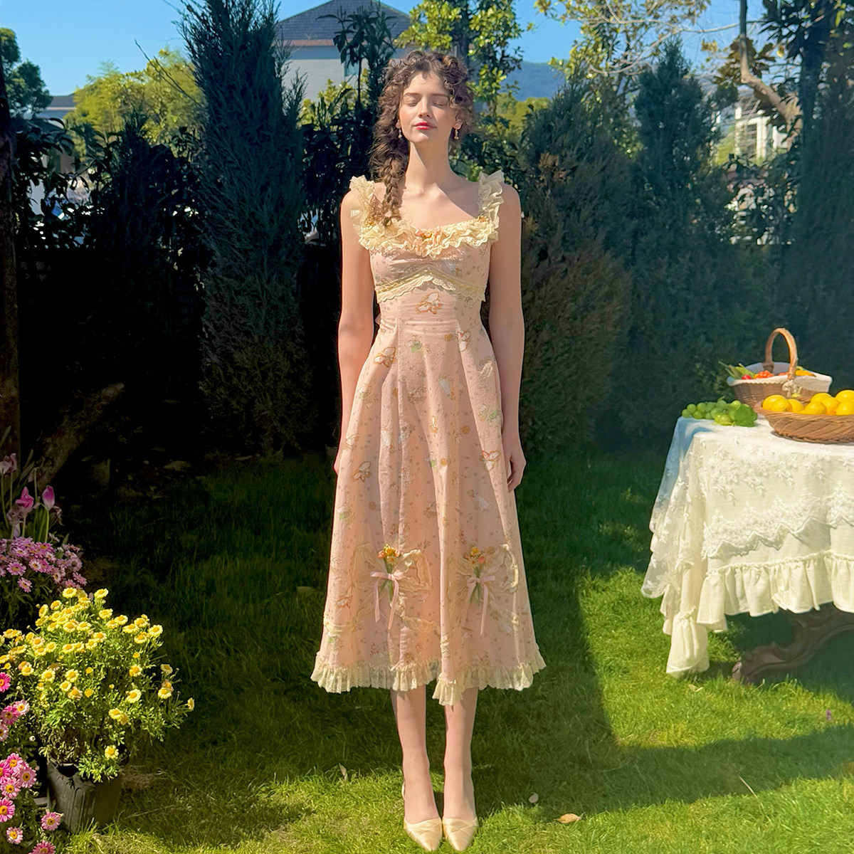 LaceMade 雏菊风筝 法式复古田园油画小人吊带长款印花蕾丝连衣裙
