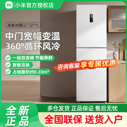 小米米家271L三开门风冷无霜冰箱家用小型宿舍用小冰箱一级能效