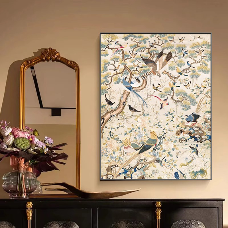 花鸟祥和图中古风客厅装饰画法式复古餐厅挂画小众卧室房间墙壁画