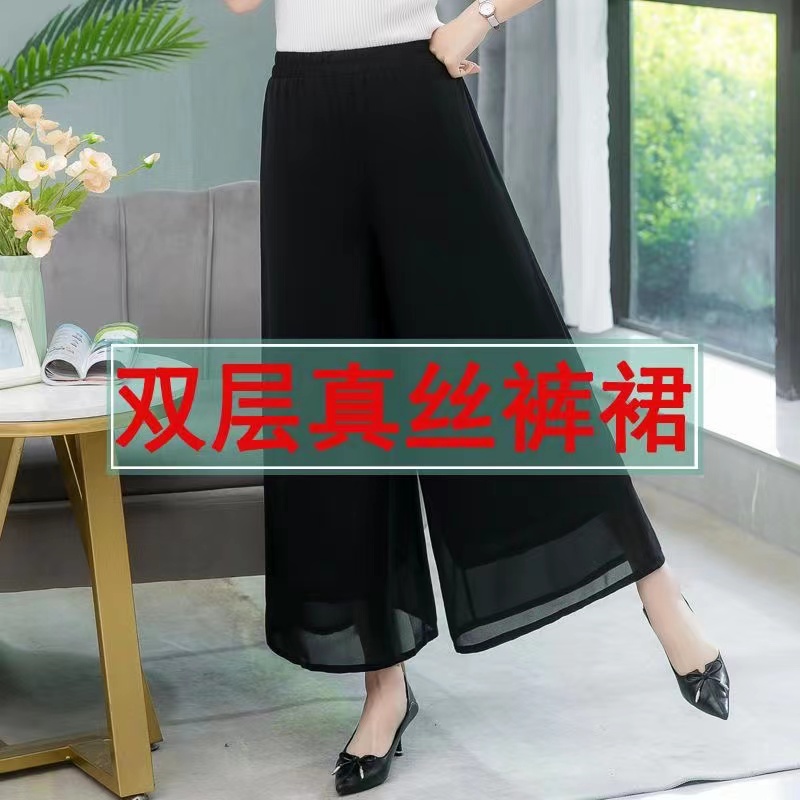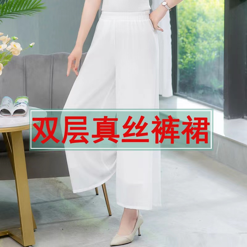 双层真丝裤子女夏2023新款高腰松紧休闲桑蚕丝裙裤垂感飘逸阔腿裤