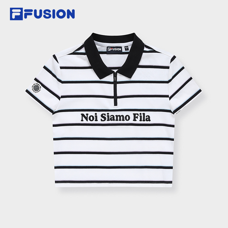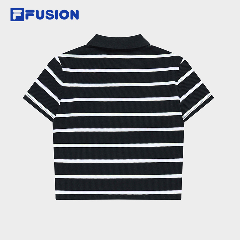 FILA FUSION斐乐潮牌女子修身短袖POLO衫2023夏时尚条纹翻领上衣