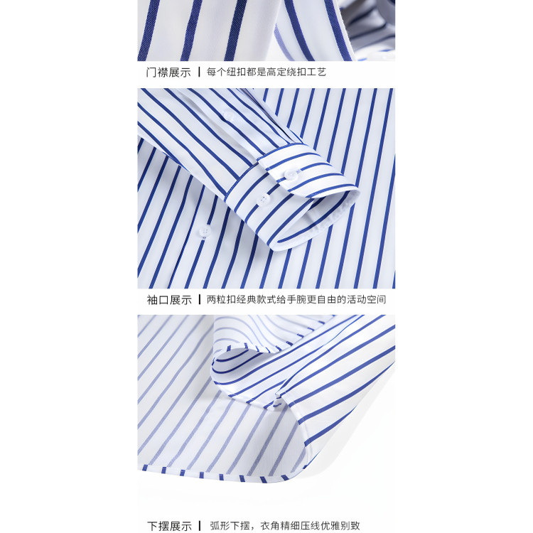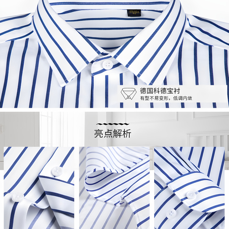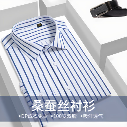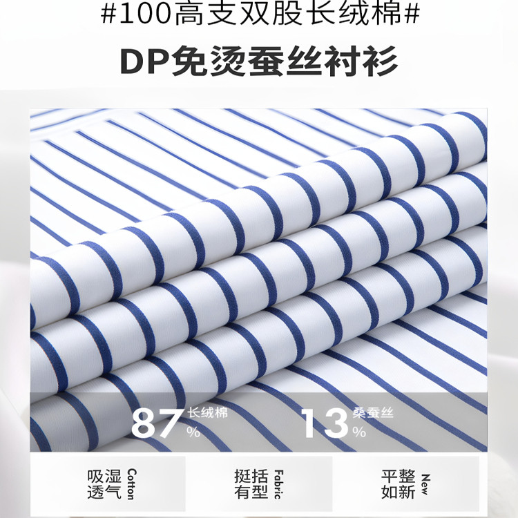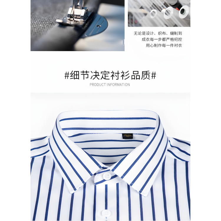 骆豪7系深蓝白条纹桑蚕丝男士短袖衬衣免熨烫抗皱正装衬衫