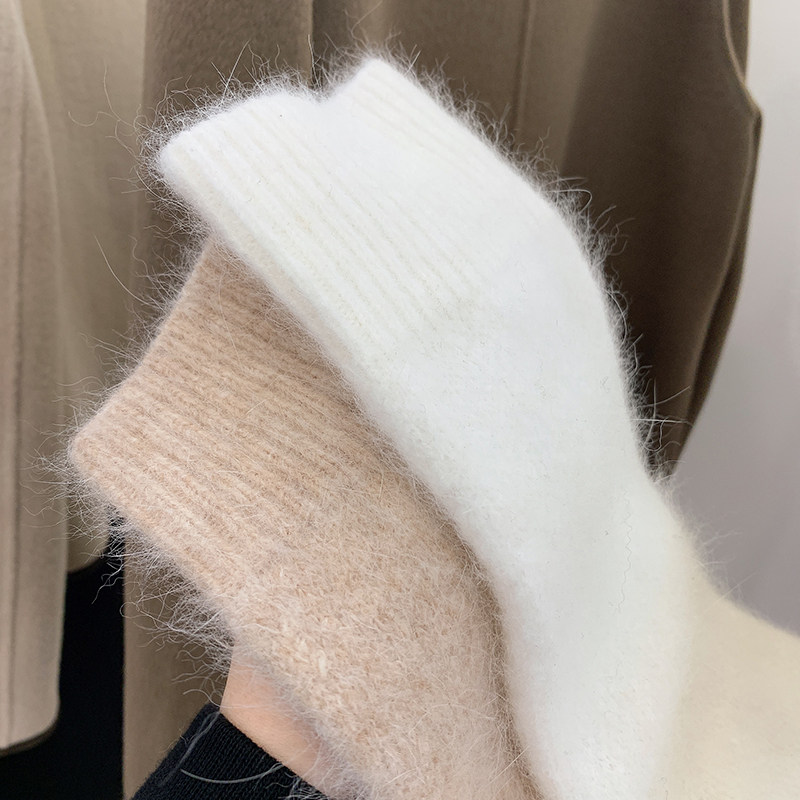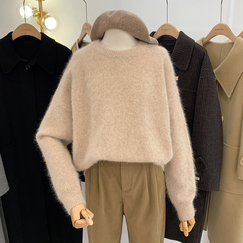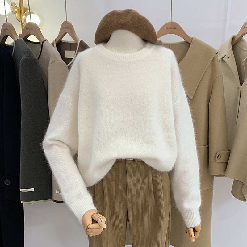 洛洛拉 白色套头毛衣女冬季新款纯色圆领宽松外穿长袖针织衫上衣