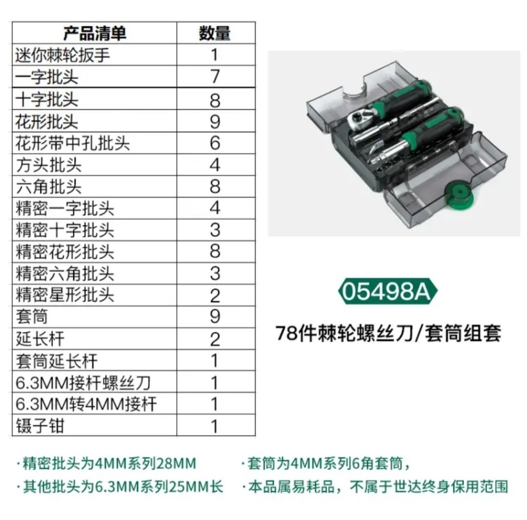 世达78件套棘轮扳手螺丝批综合组套一字十字螺丝刀精密套装05498A