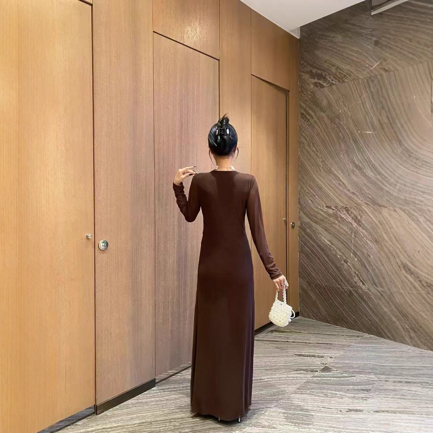 高级感晚装宴会礼服裙长裙2025秋女长袖圆领纯色重工压褶连衣裙