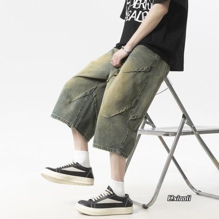 水洗做旧牛仔七分裤男褶皱设计感解构裤子夏季短裤宽松直筒阔腿裤