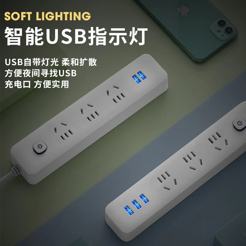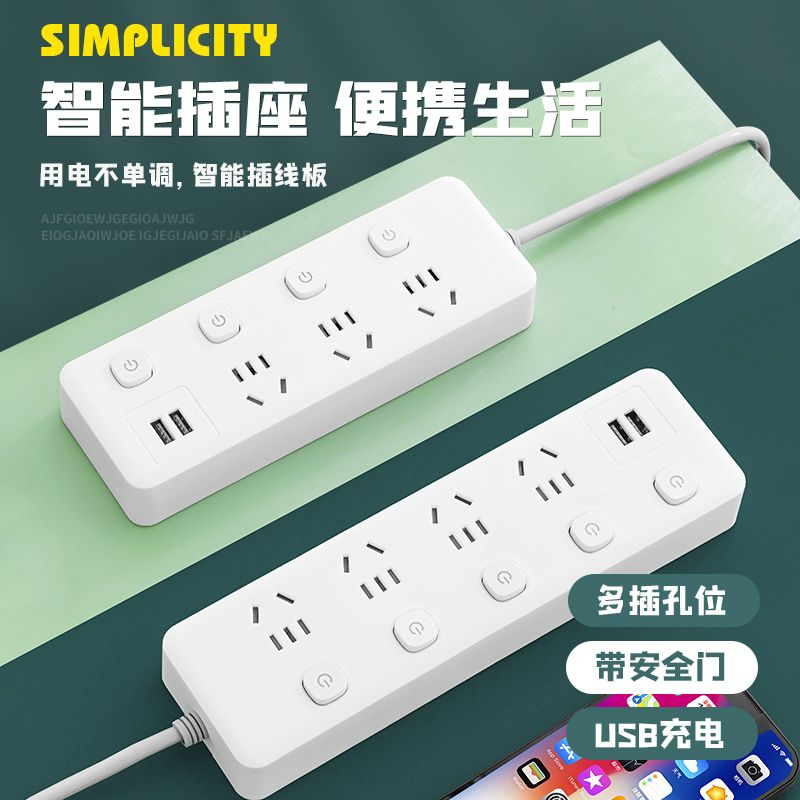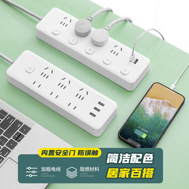 米白多功能插座家用插排插线板带线多孔拖线接线板带USB纯铜芯