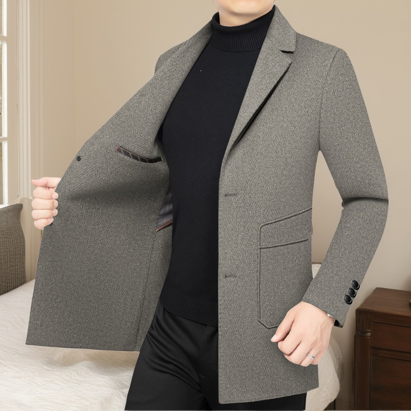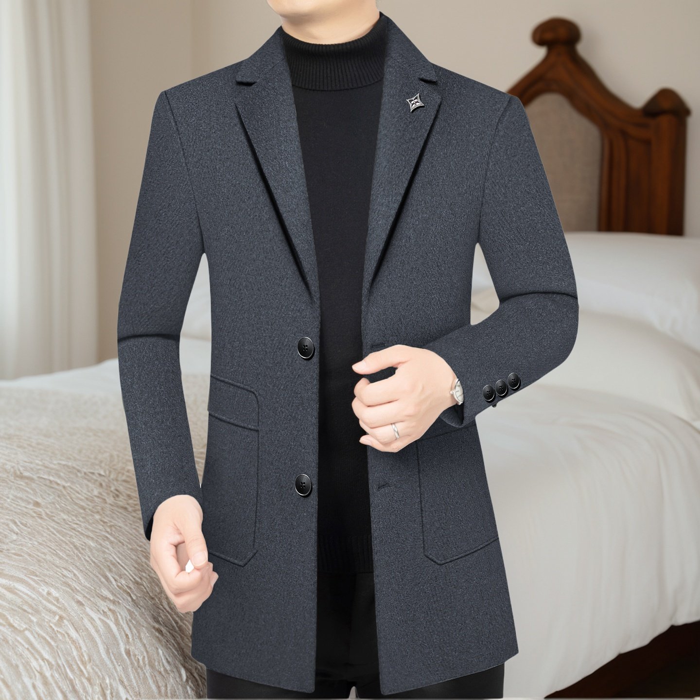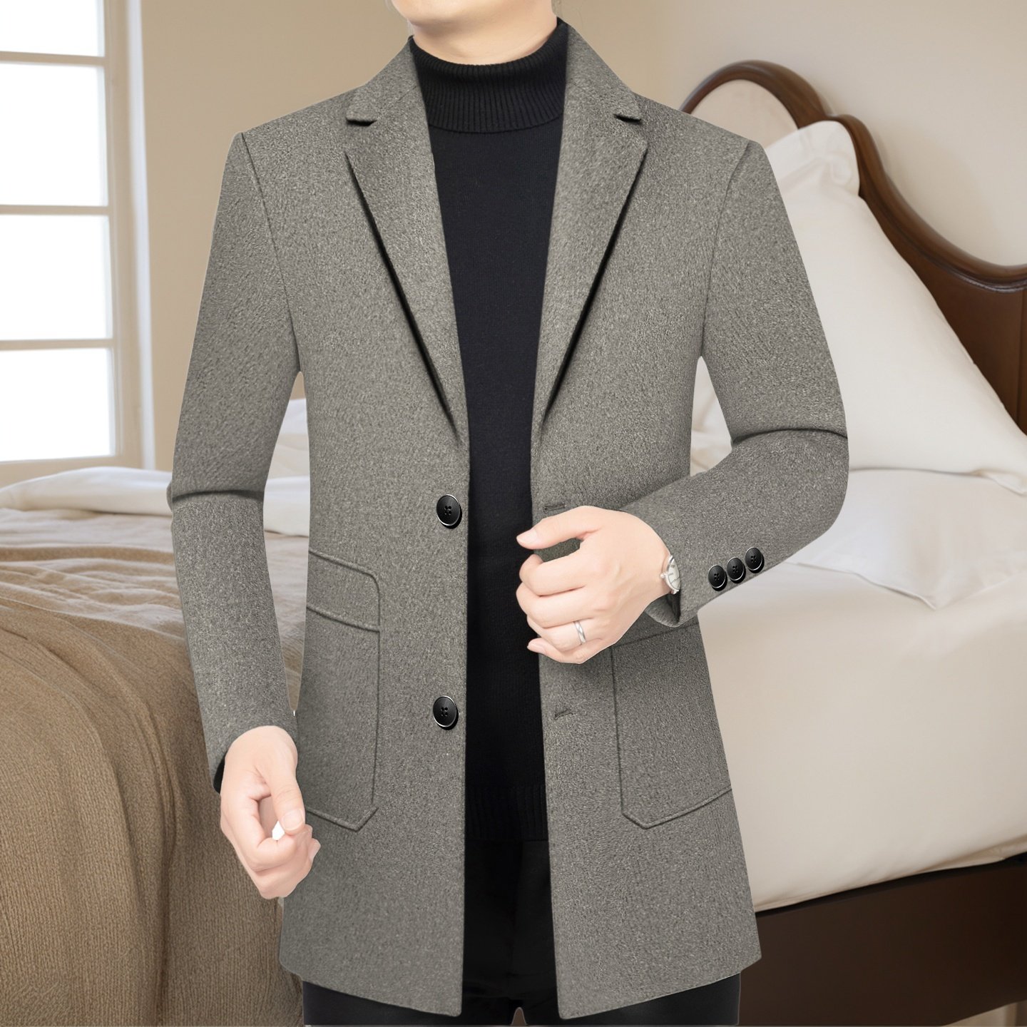 翻领羊毛呢大衣外套男休闲双面呢