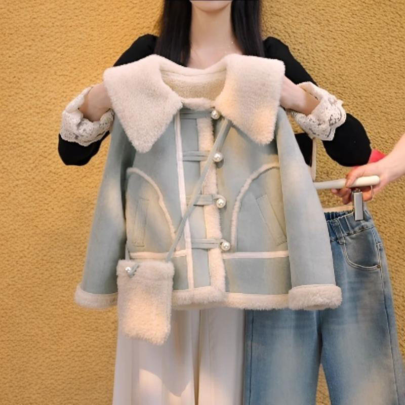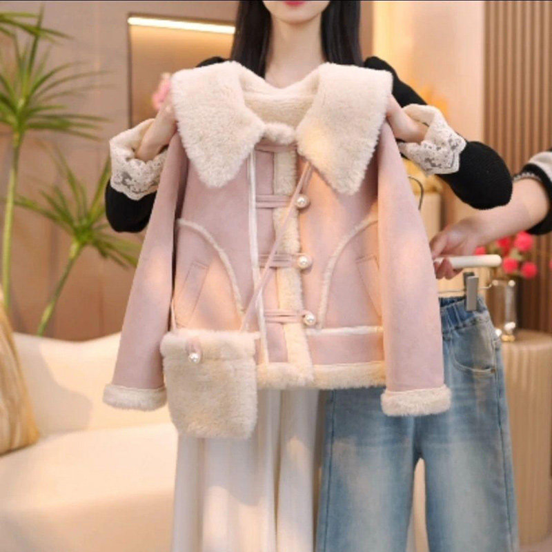 冬季韩版皮毛一体外套女童翻领大衣加绒加厚2025新款儿童毛呢上衣