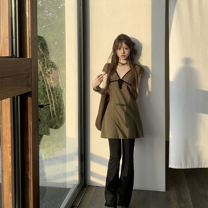法式复古高级感纯欲蝴蝶结v领碎花连衣裙夏季新款小众A字裙短裙女