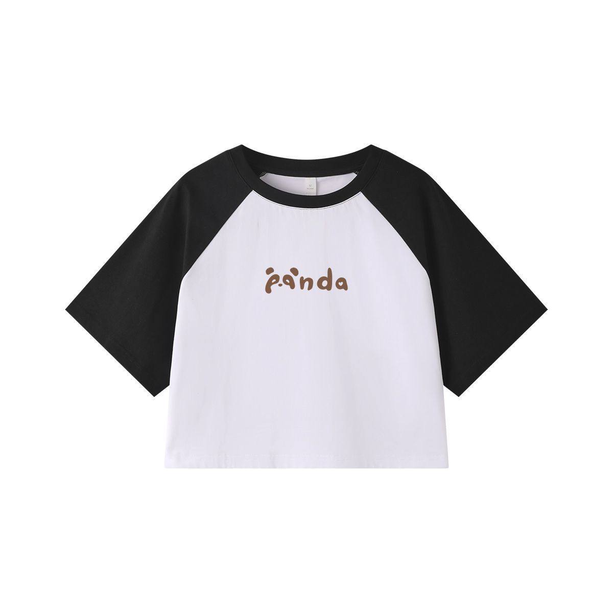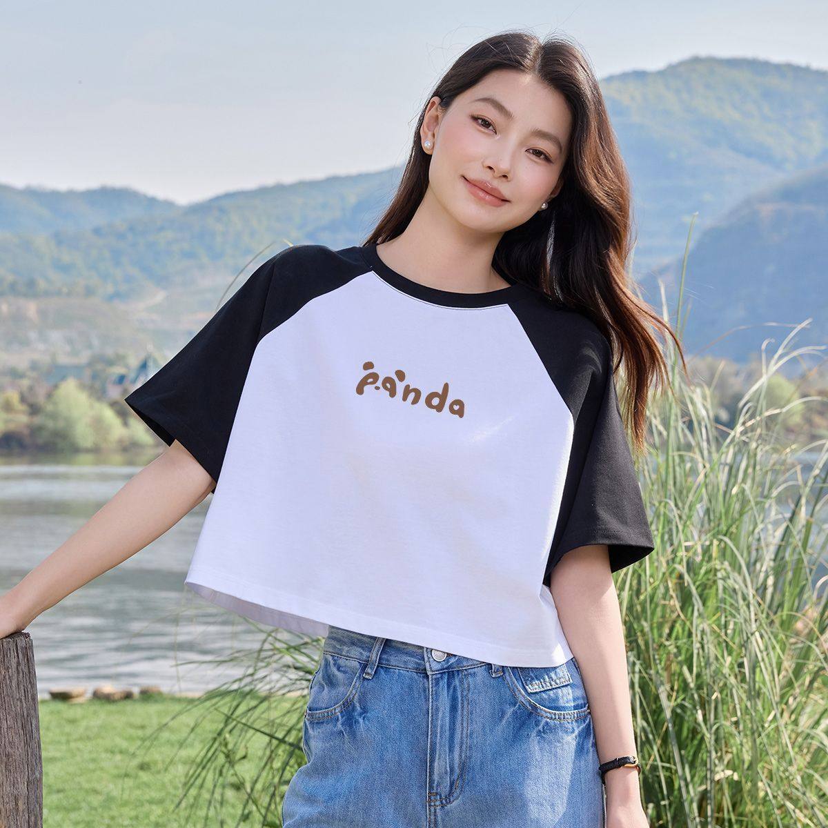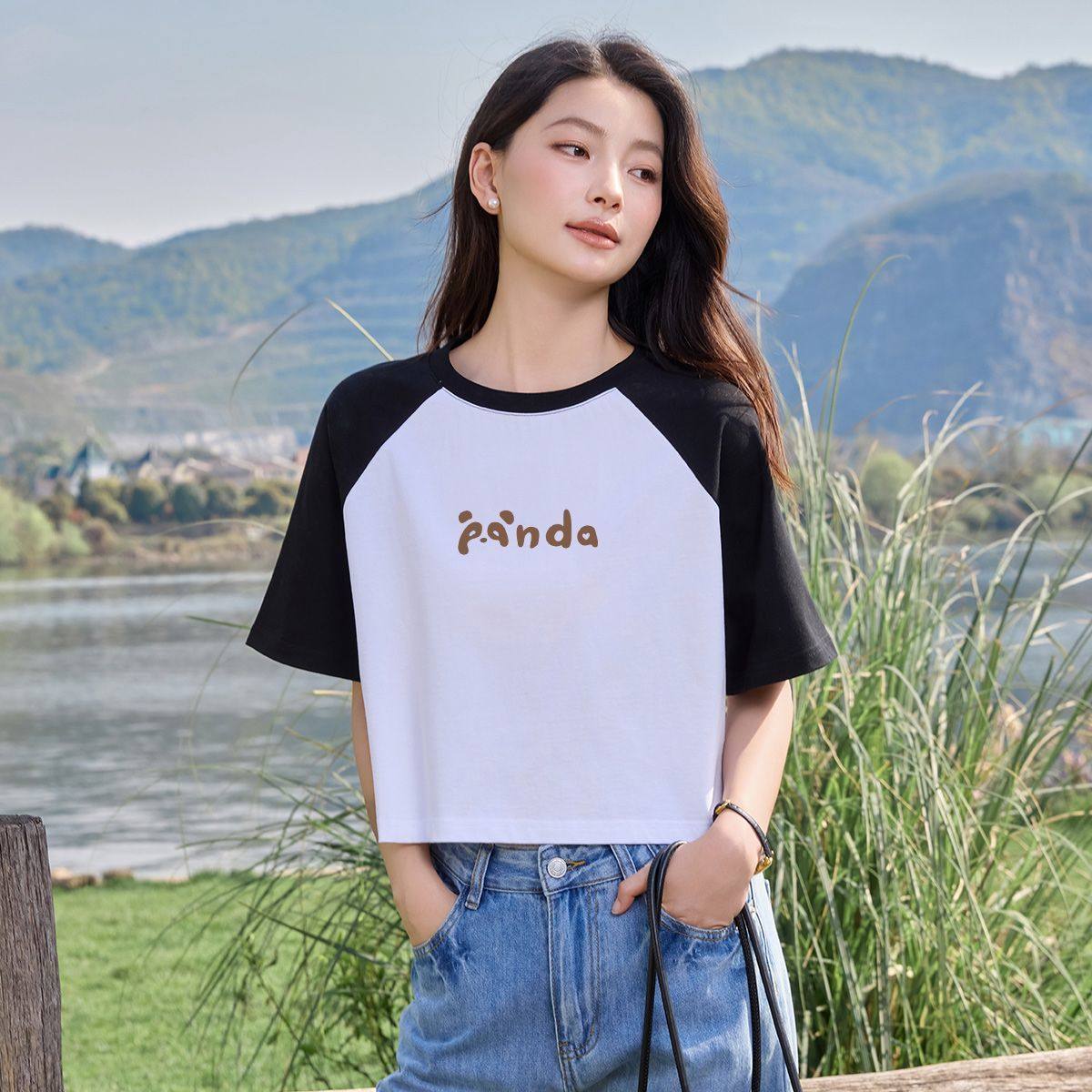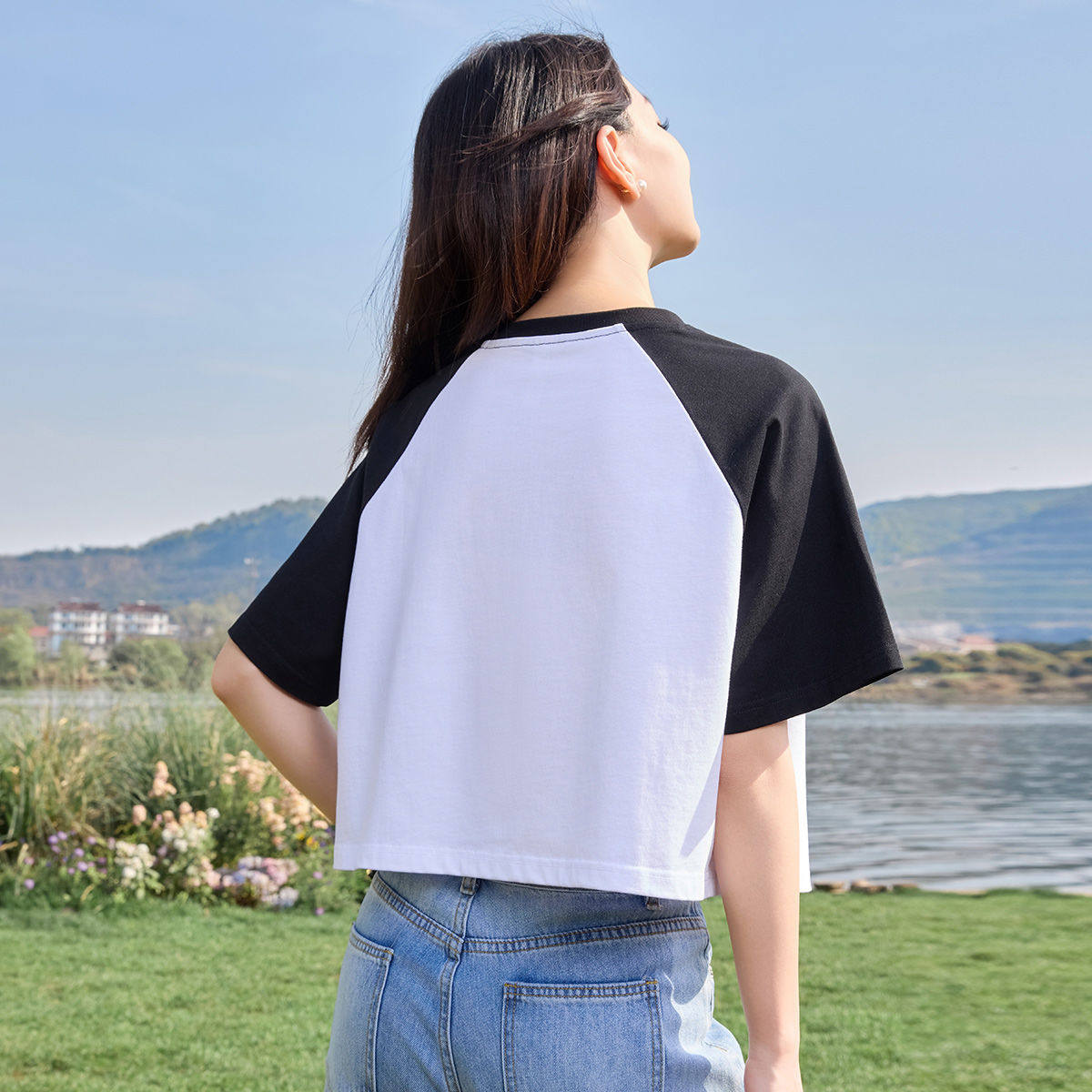 茵曼【100%棉】2025年夏季美式复古撞色拼接插肩袖圆领短袖T恤女