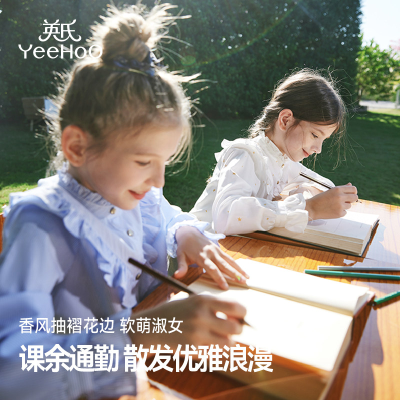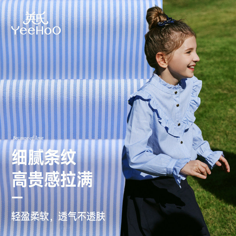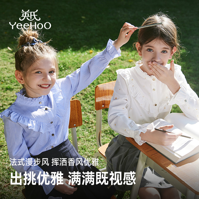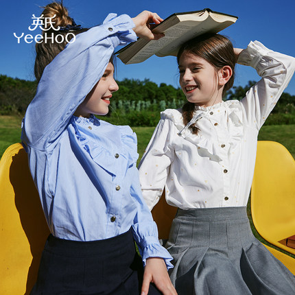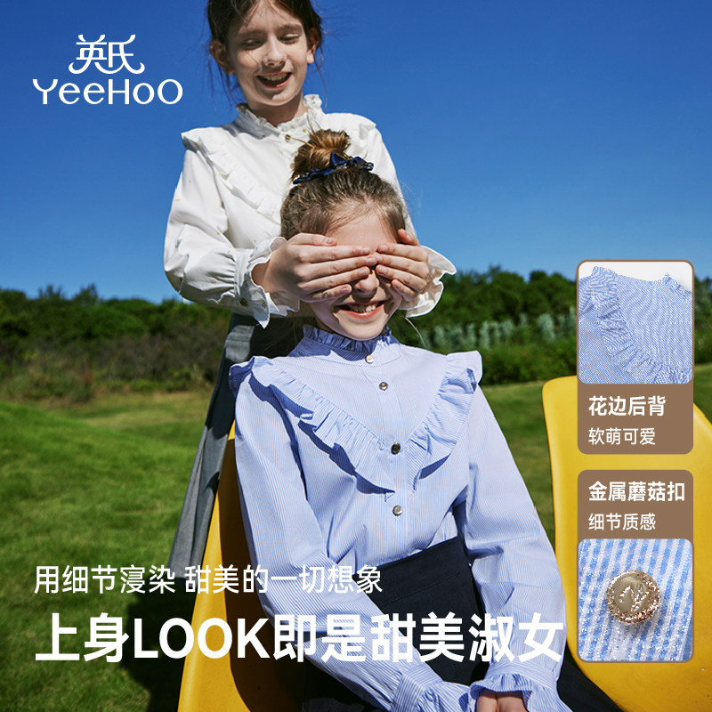 英氏女童长袖衬衣秋季儿童纯棉喇叭袖衬衫中大童花边立领学院上衣