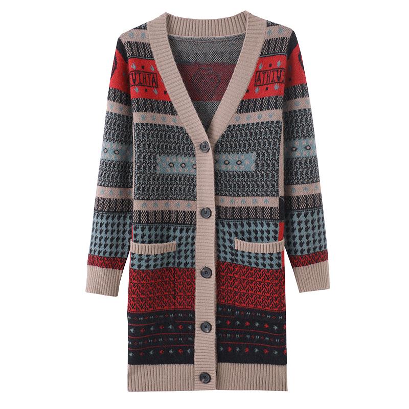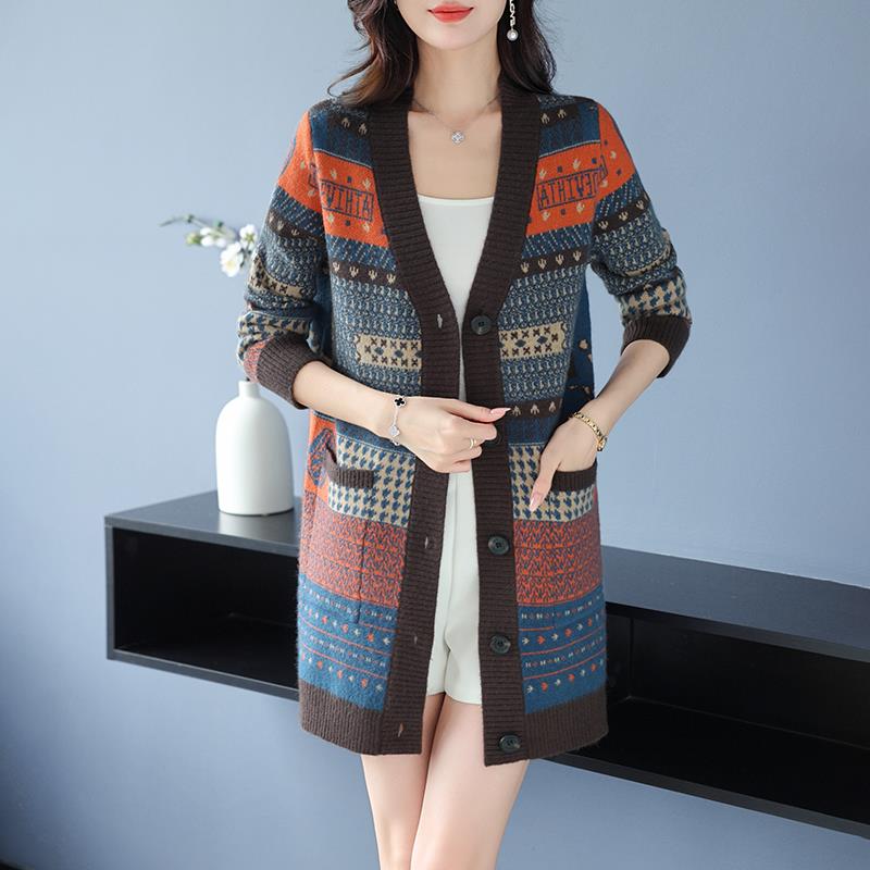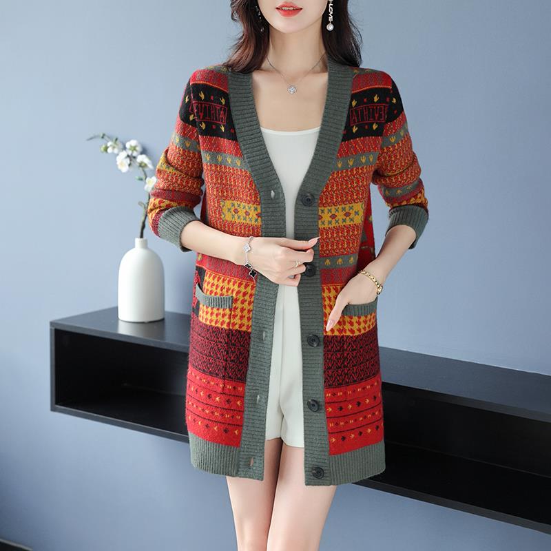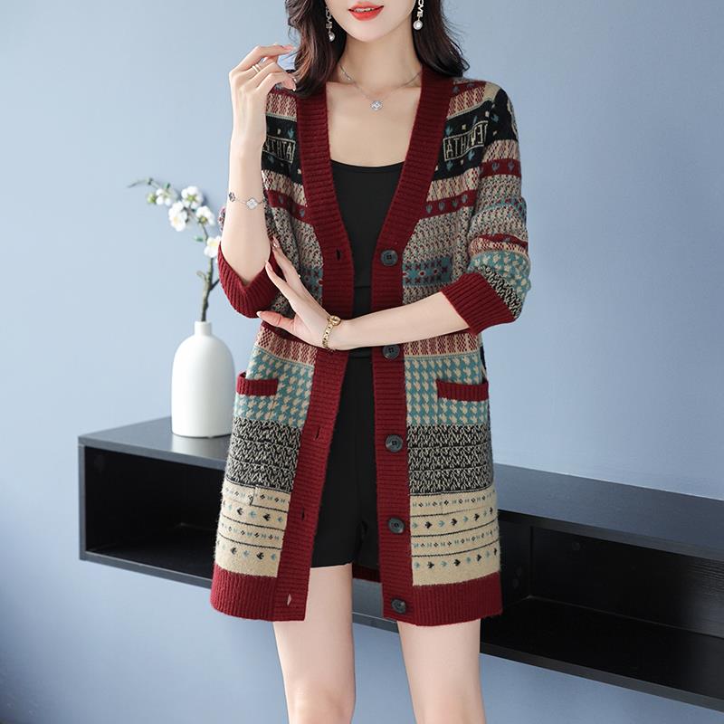 羊毛衫女针织开衫拼色宽松外搭披肩春秋洋气妈妈装中长款毛衣外套