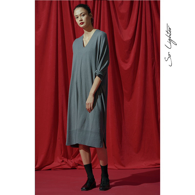 solighter独立设计秋冬宽松全羊毛V领针织连衣裙女直筒纯色中长裙