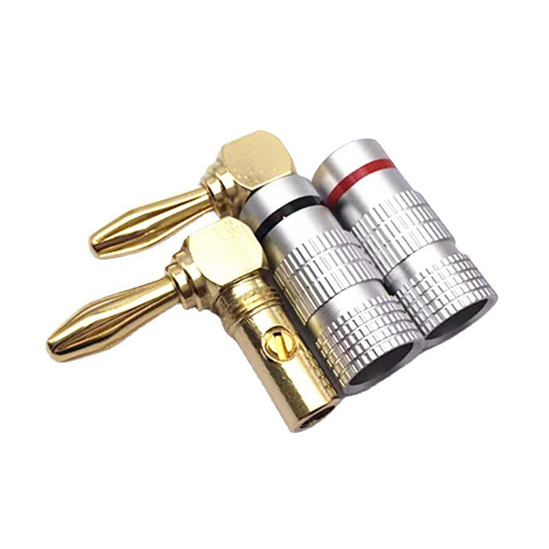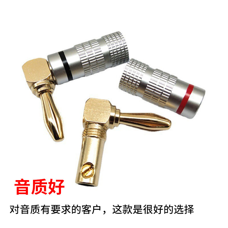 铜镀金90度香蕉插头 免焊接 4MM弯头 红黑圈音响喇叭线插头 L型