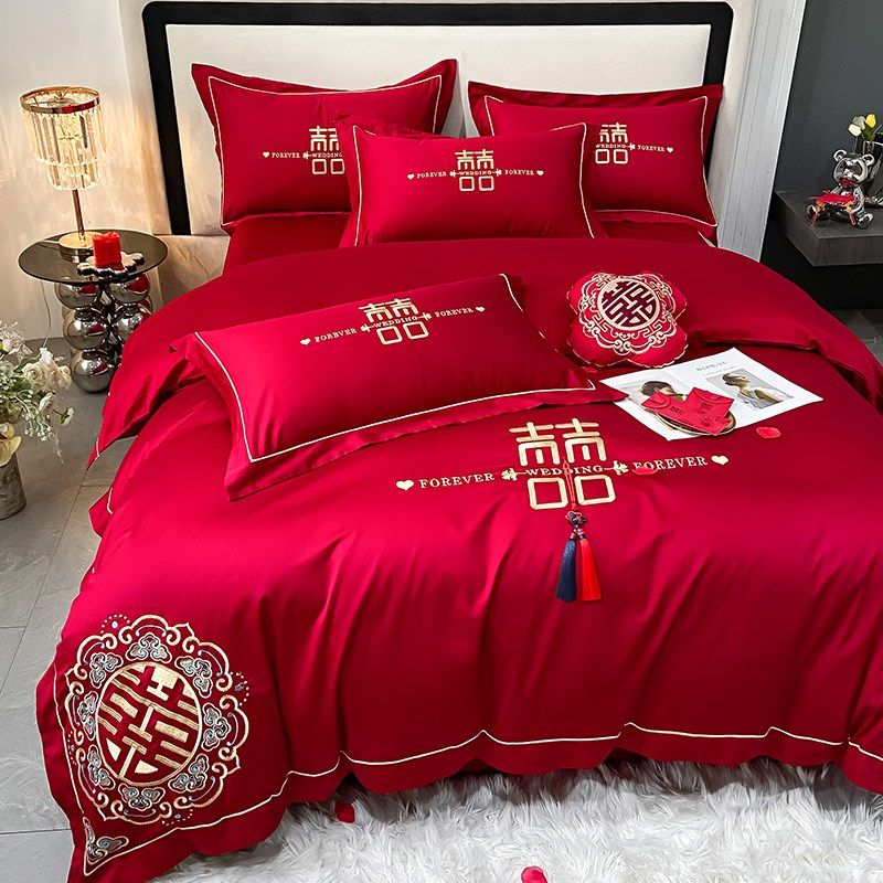 婚庆四件套大红刺绣喜被六件套新结婚婚房嫁全棉床单床上用品