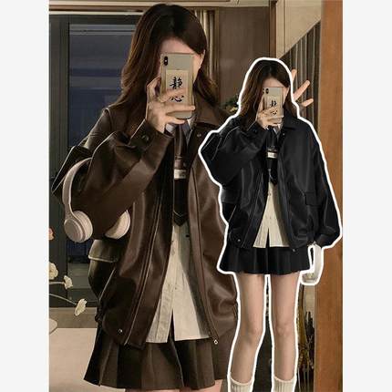 美式复古皮衣夹克外套女春秋季黑色甜酷风机车PU皮宽松修身长袖上