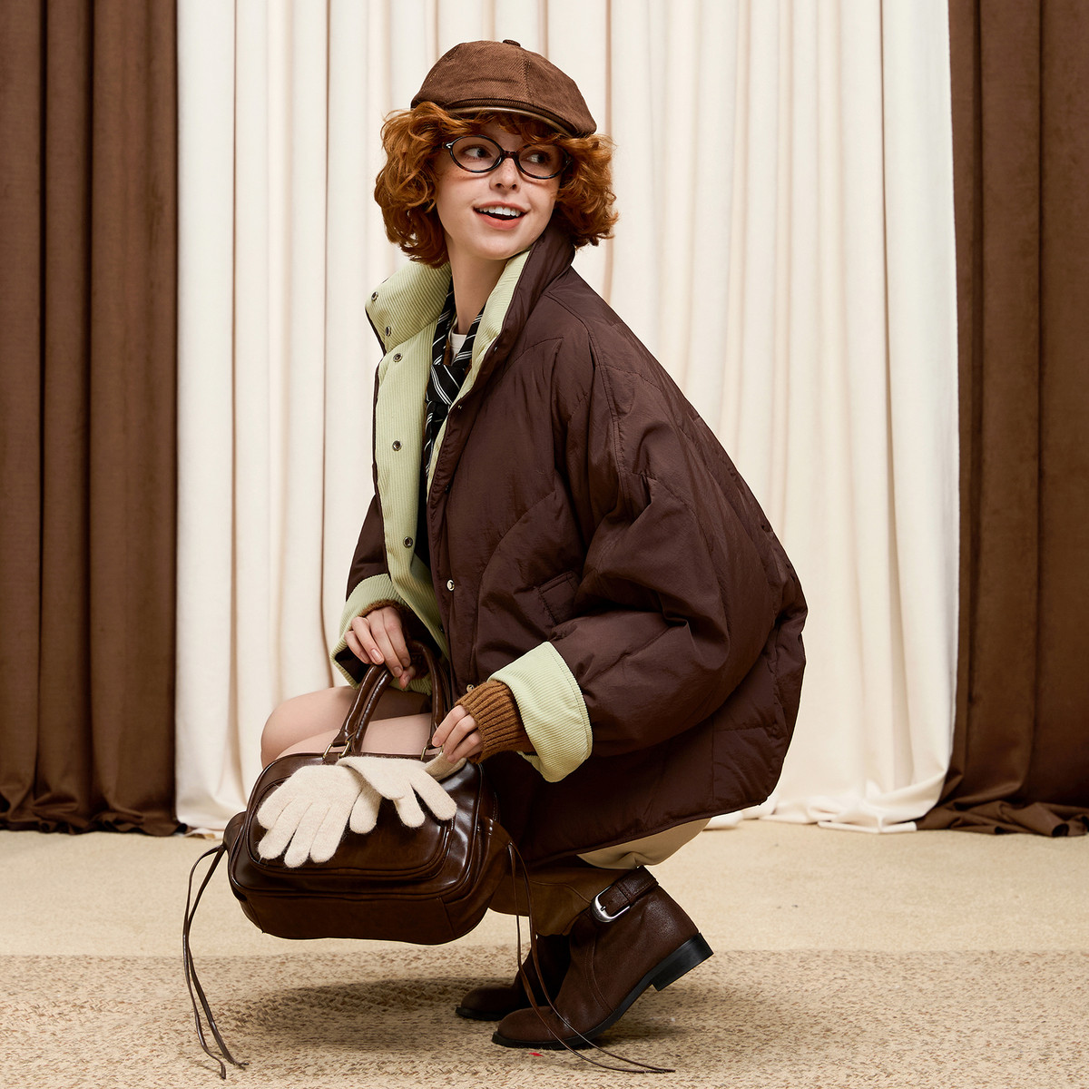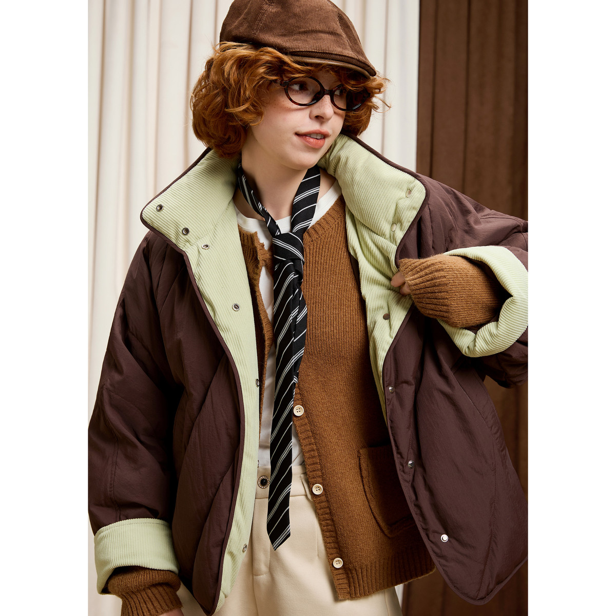 唐狮2025冬季新款短款羽绒服女撞色灯芯绒拼接蝙蝠袖立领防寒保暖