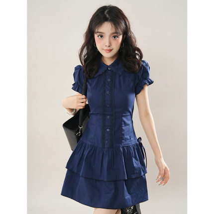 vintage复古穿搭学院风蕾丝边拼接蓝色复古衬衫连衣裙古着风短裙