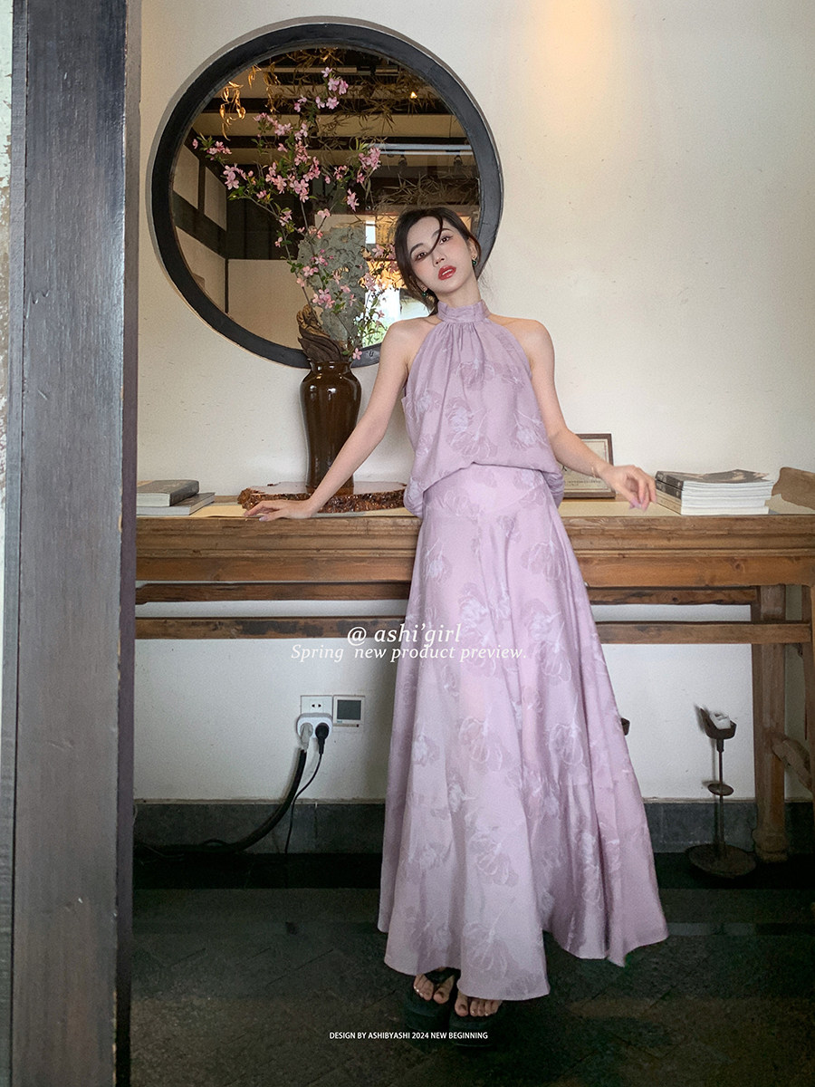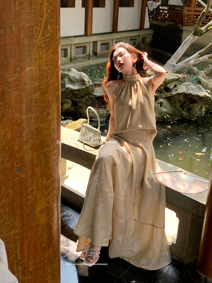 大于诗集 复古新中式挂脖花朵背心上衣女小个子A字半身裙套装夏季