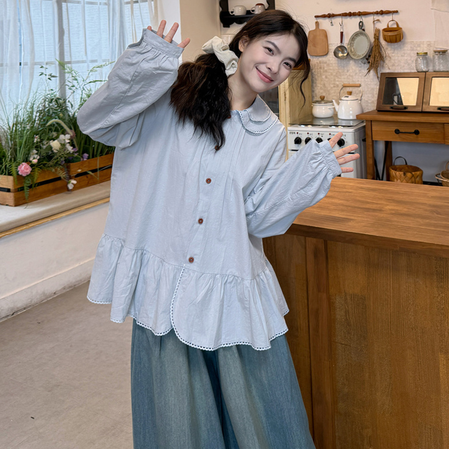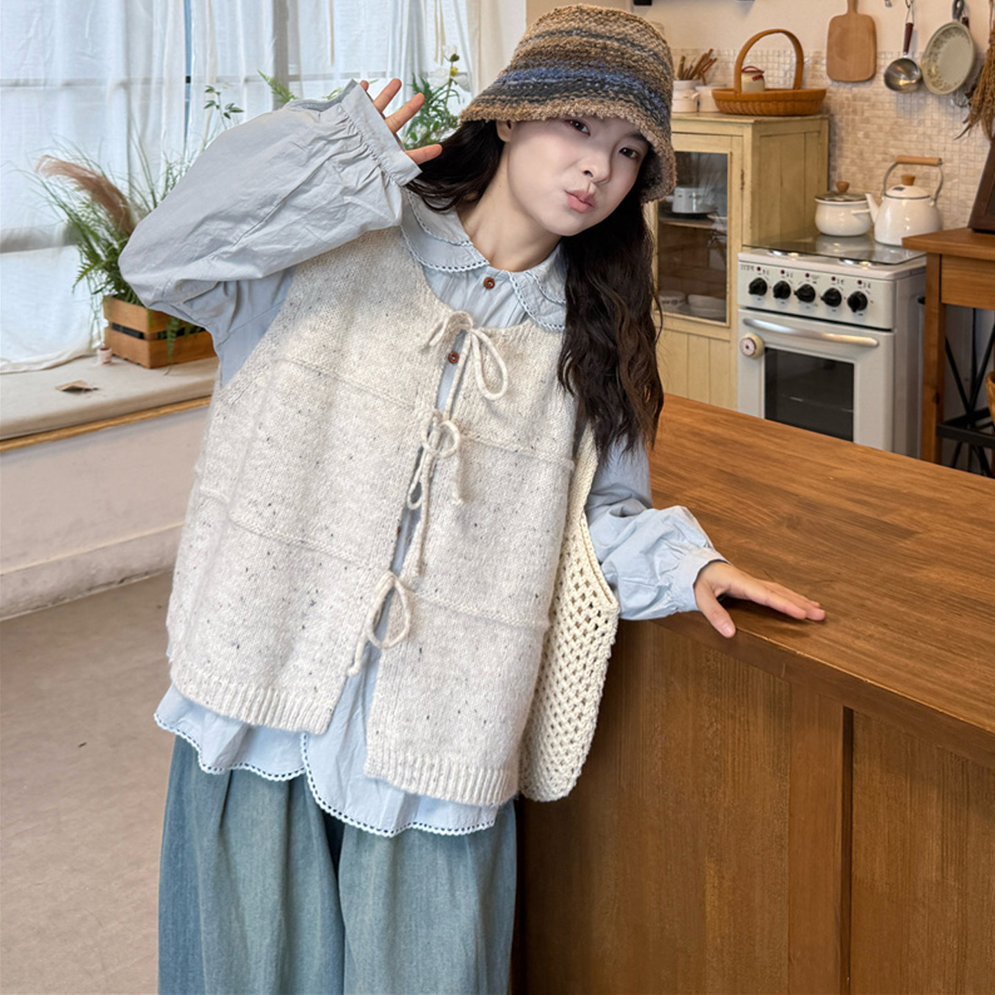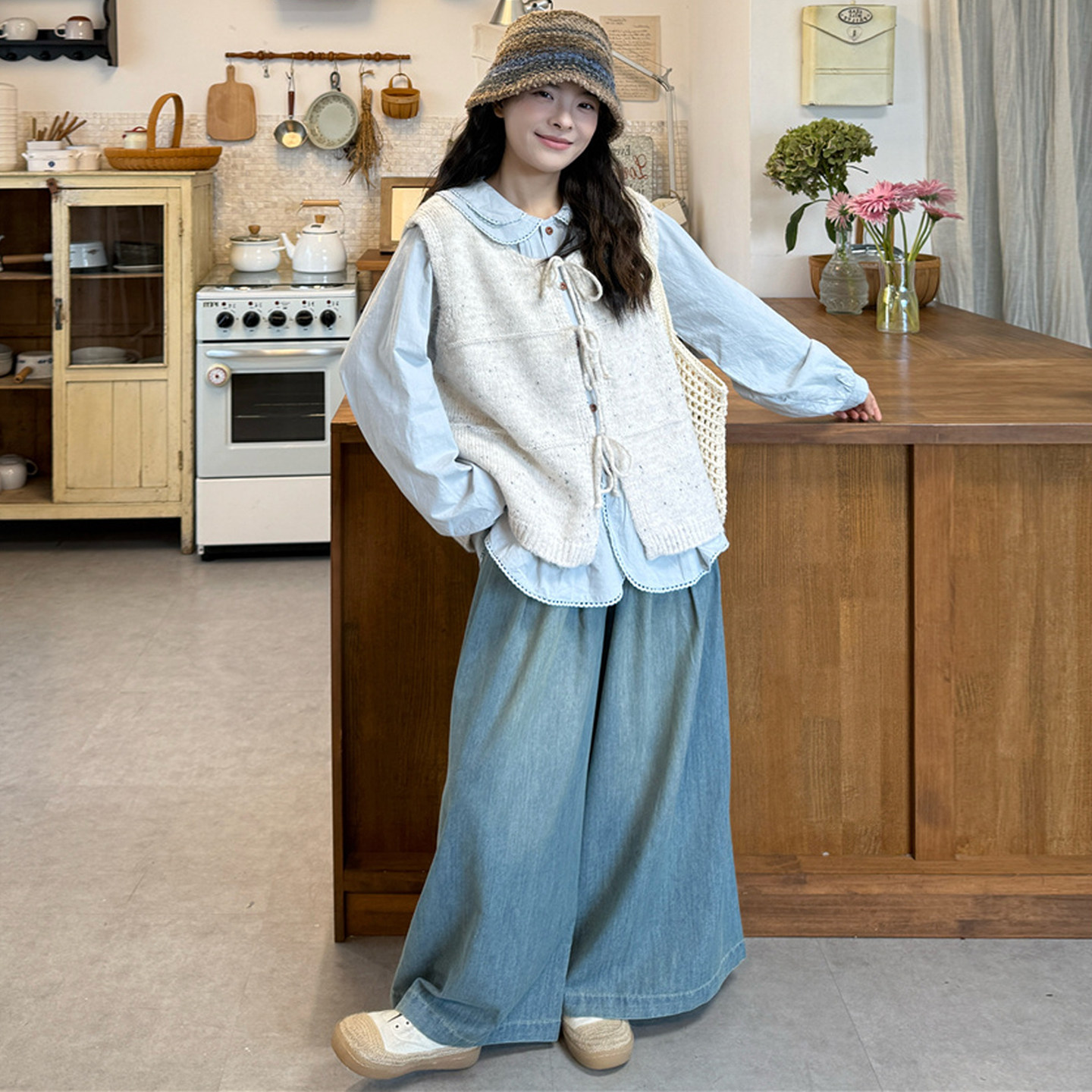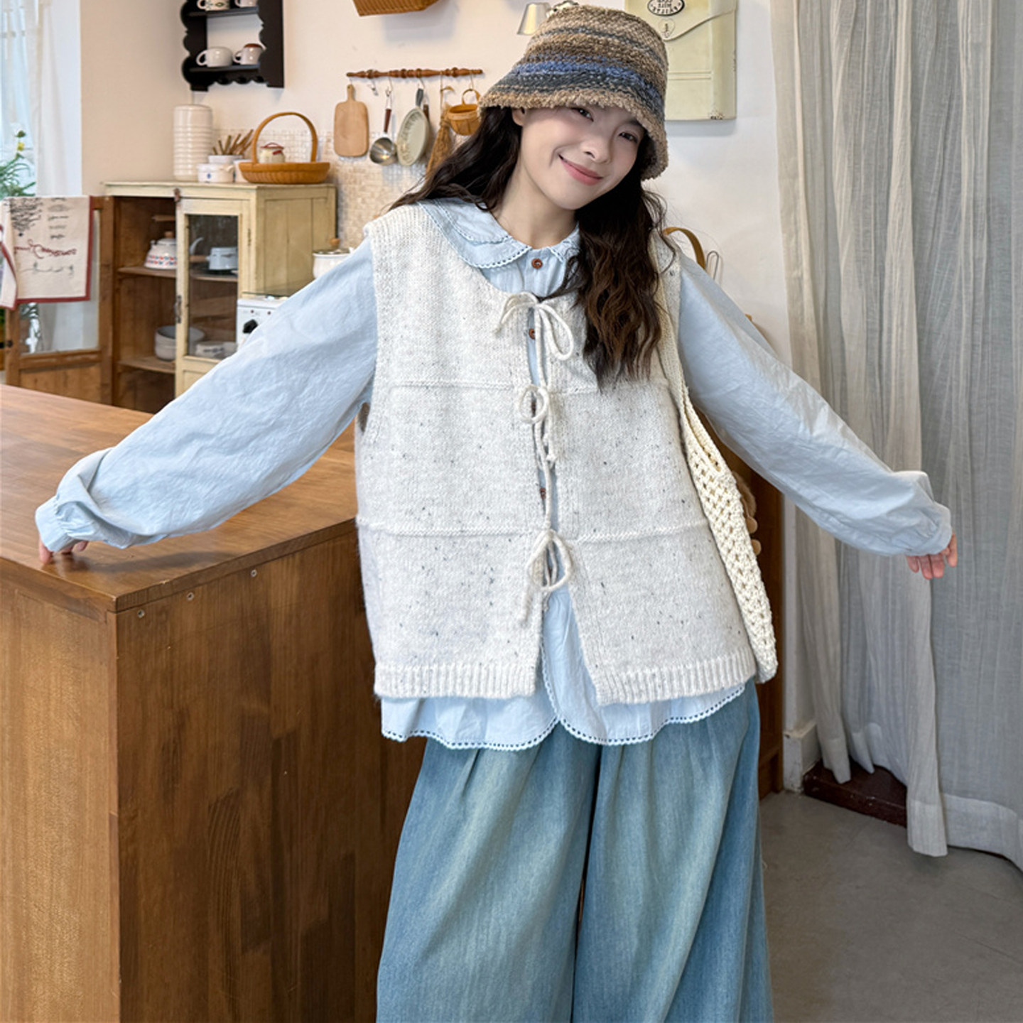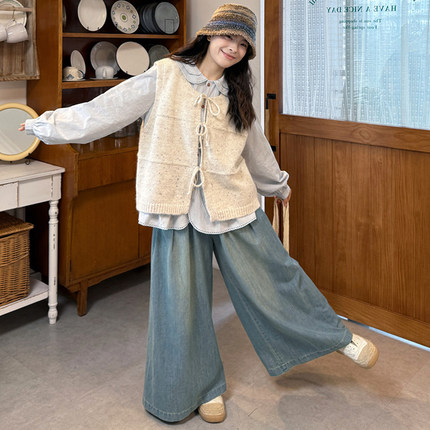 娃娃领衬衫+针织马甲+牛仔阔腿裤