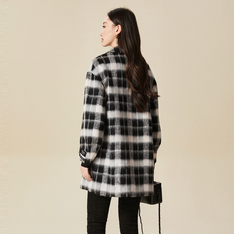 XG雪歌黑白格纹设计毛呢外套时尚冬季新款中长款通勤绵羊毛大衣女