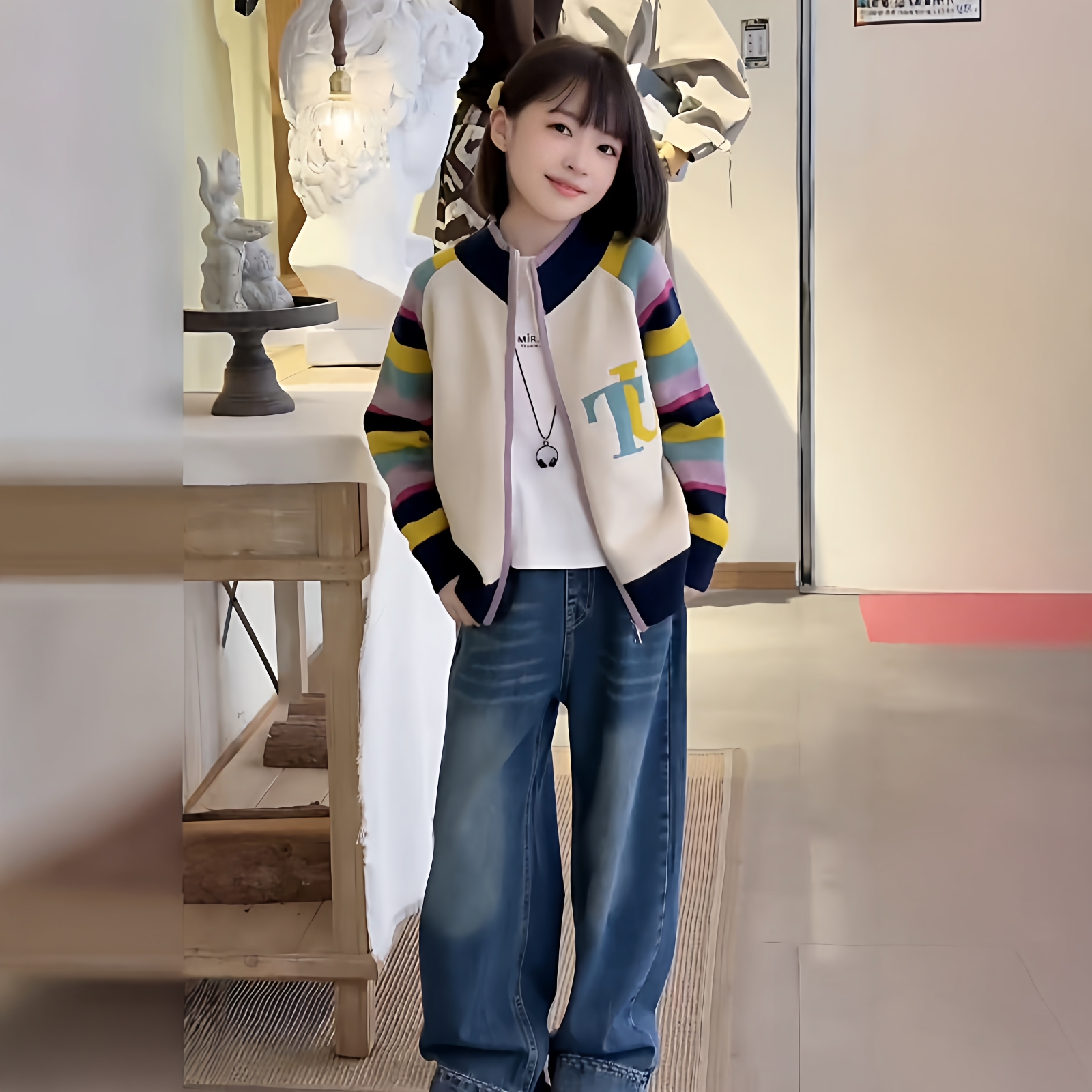 女童秋冬设计感彩色条纹立领毛衣开衫外套显瘦牛仔阔腿裤套装韩版