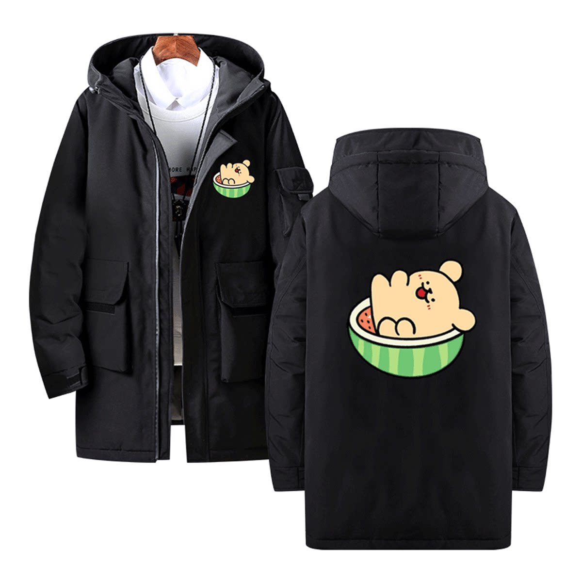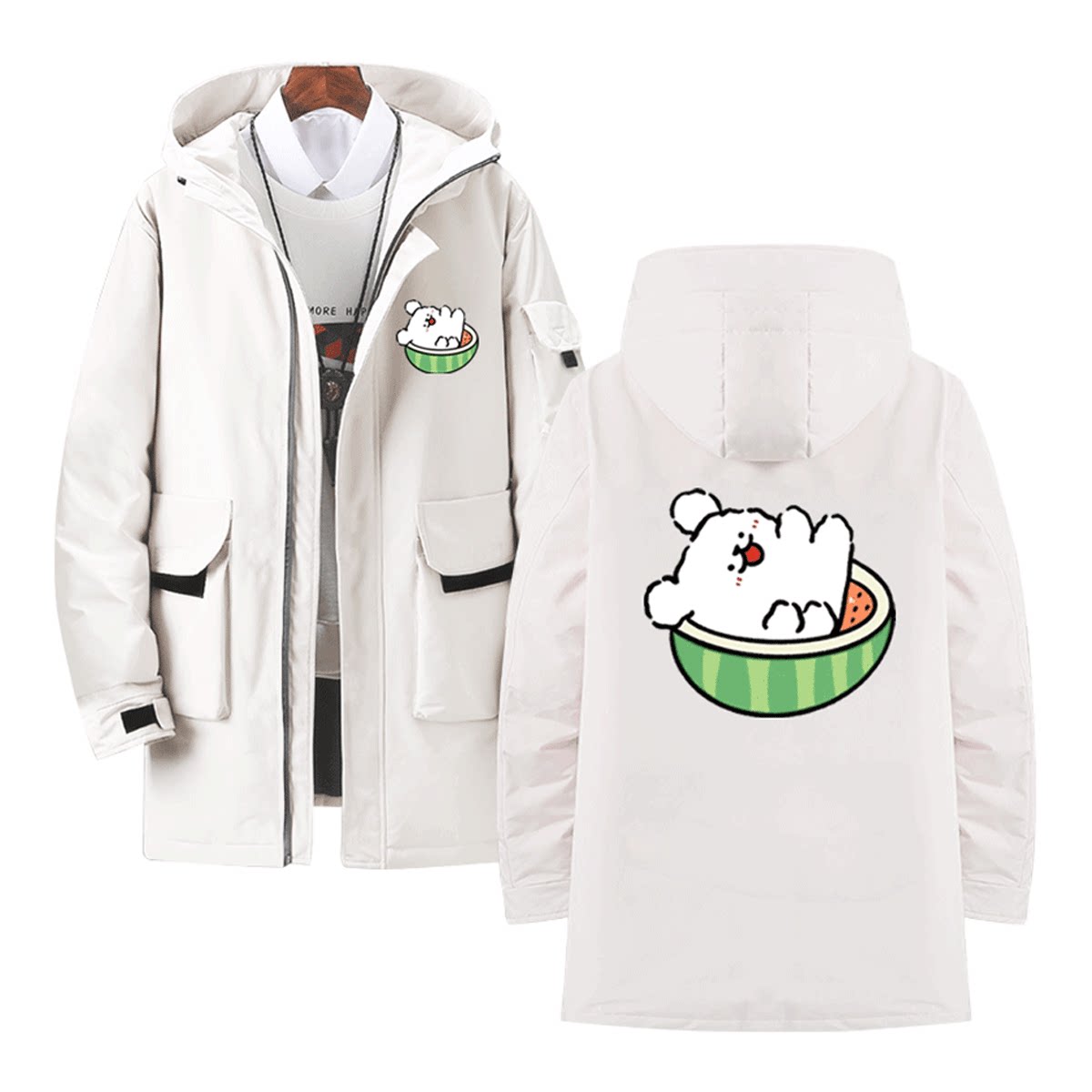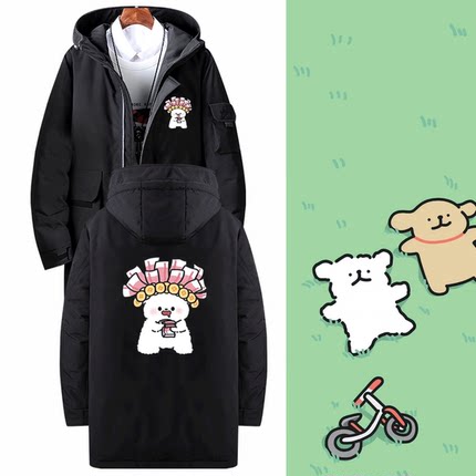 马尔济斯线条小狗联名卡通可爱男情侣可定制中长款连帽外套羽绒服